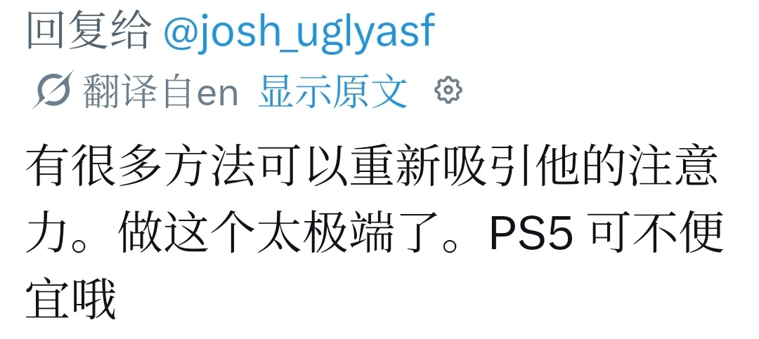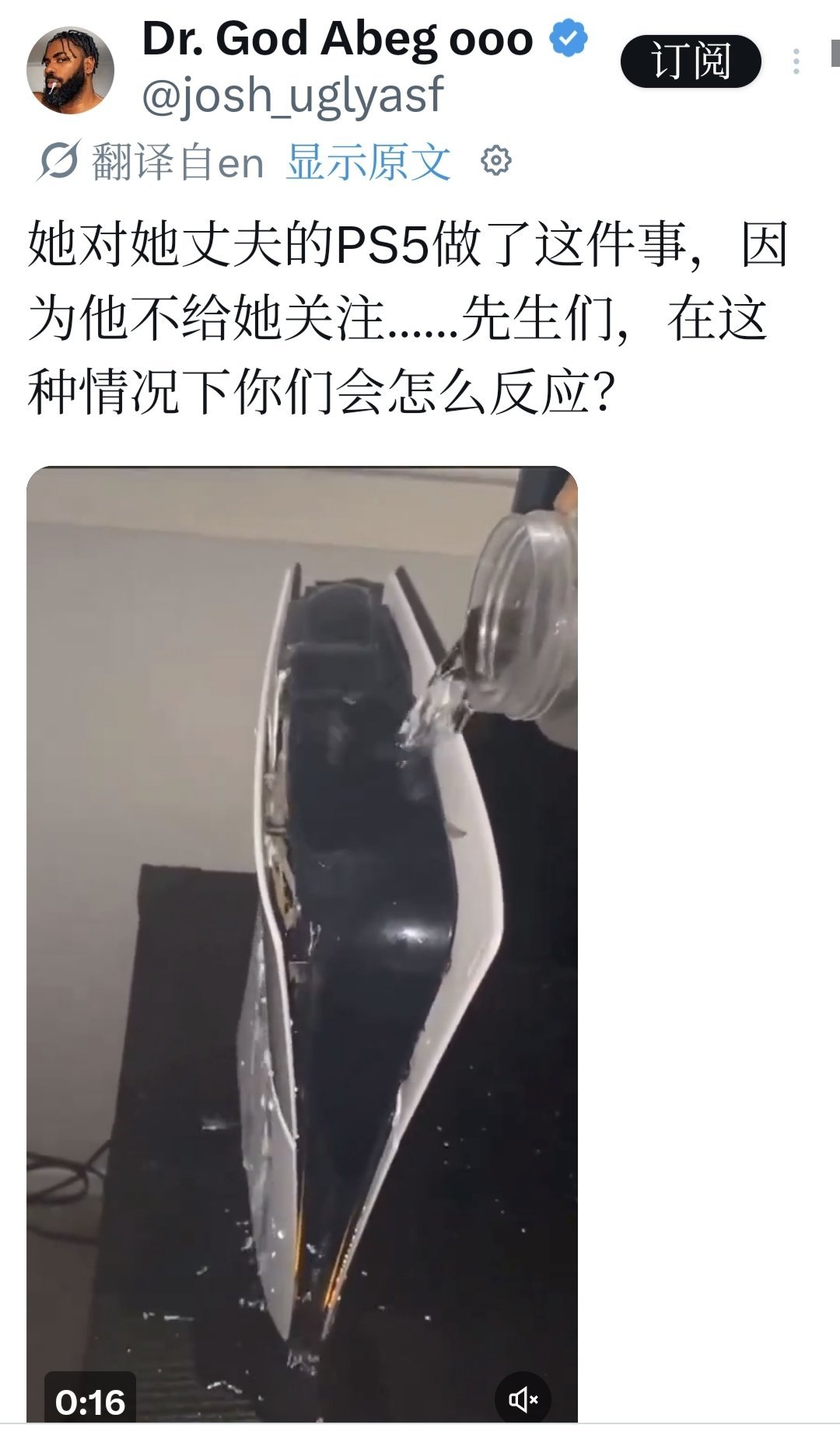 博主發文稱:“因爲丈夫不給她關注,她就這樣對待他的PS5……紳士們,換作是你會有什麼反應?”