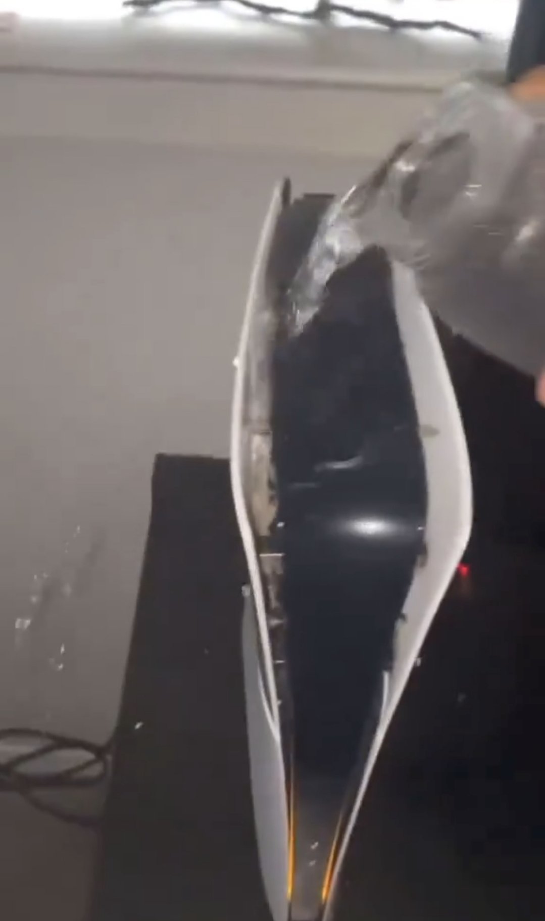 一位自稱“mostly unserious”的心理治療師背景的博主,擁有超30萬粉絲。最近在網上分享了一則視頻,視頻內容是一名女子將整杯水直接倒在了通電的PS5遊戲機上,整個過程持續十幾秒,直到杯子倒空。PS5主機被水完全浸透,外殼上佈滿水珠和水流。