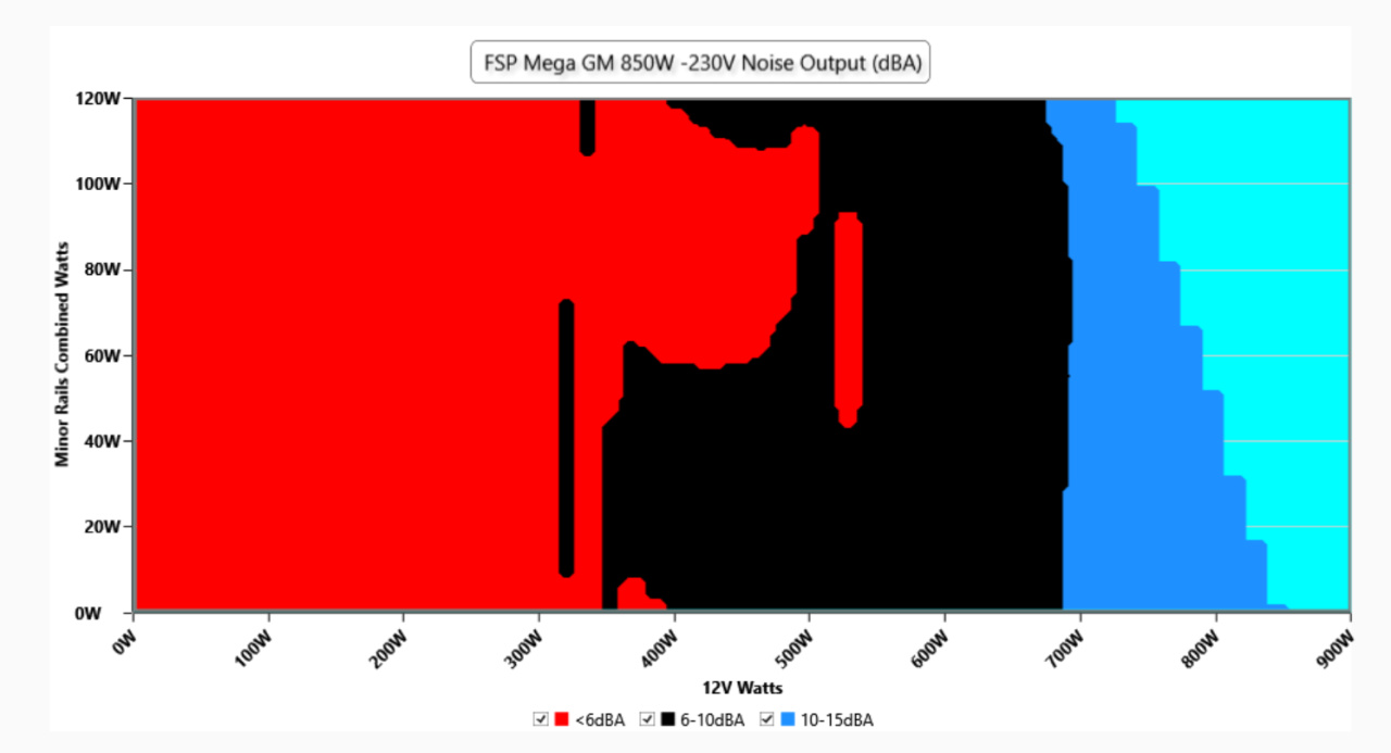 在230V输入电压下的噪音测试中,按给到的热力图可见,在开启ECO模式下,350W功率以下,基本上能做到<6 dBA的噪音表现。