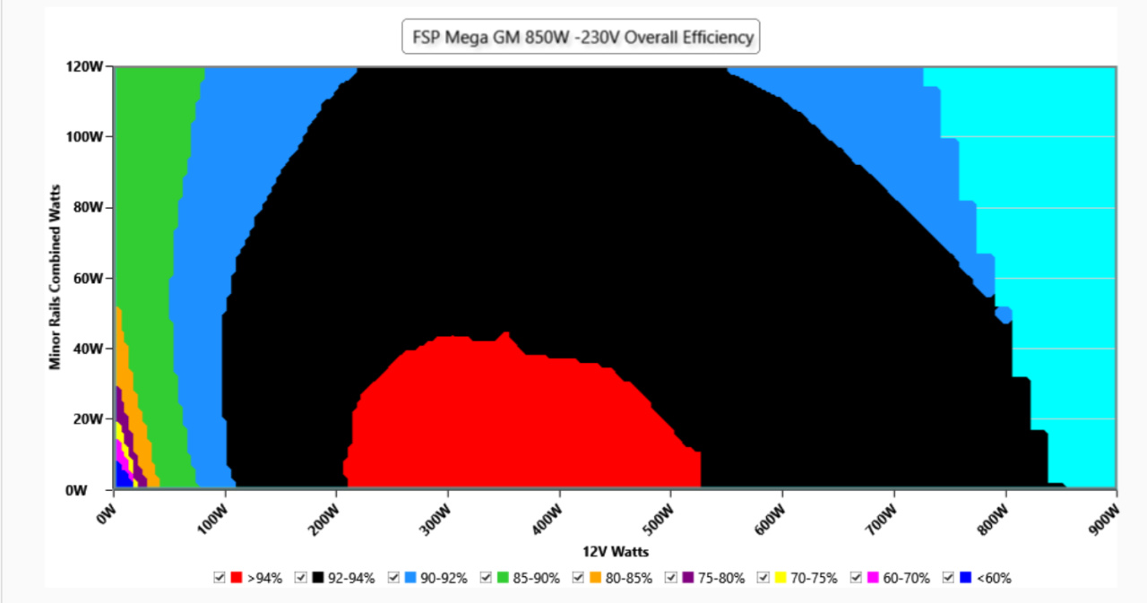 在另外一张更加直观的转换效率图表中,除了极少部分功率场景下,这枚电源可以做到90%以上的转化率,在某种程度上也意味着更低的发热和噪音。