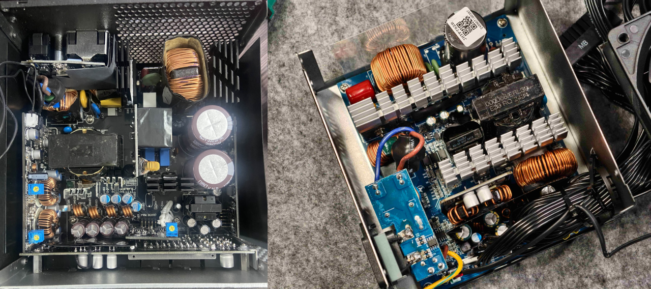 为了满足ATX 3.1规范里的瞬时大电流需求,整体架构还做了相应优化,比主动式PFC+双管正激(右)方案表现更好,发热量也更低,集成度更高。