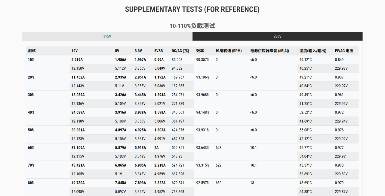 首先在230V负载测试中,在40%负载下转换效率最高,达到了94%。并且在低载和重载情况下,转换效率均已超过了80 Plus白金认证的标准。