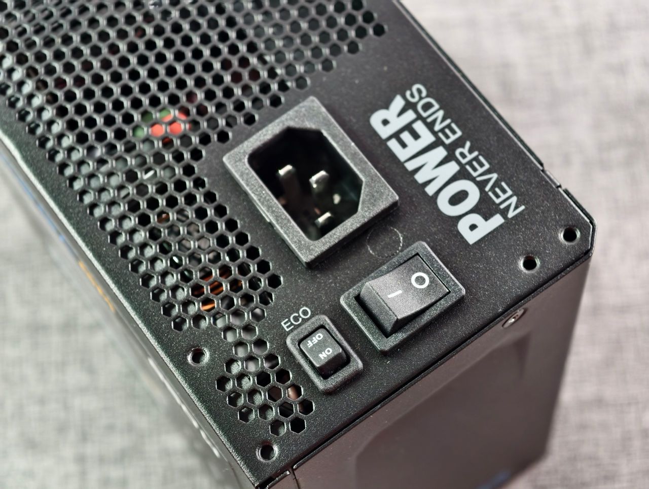 电源背部除了独立电源开关外,还配备了ECO半被动风扇控制开关,用来调节风扇启停模式。大家可以在静音优先和压低电源温度这两种模式之间选择。