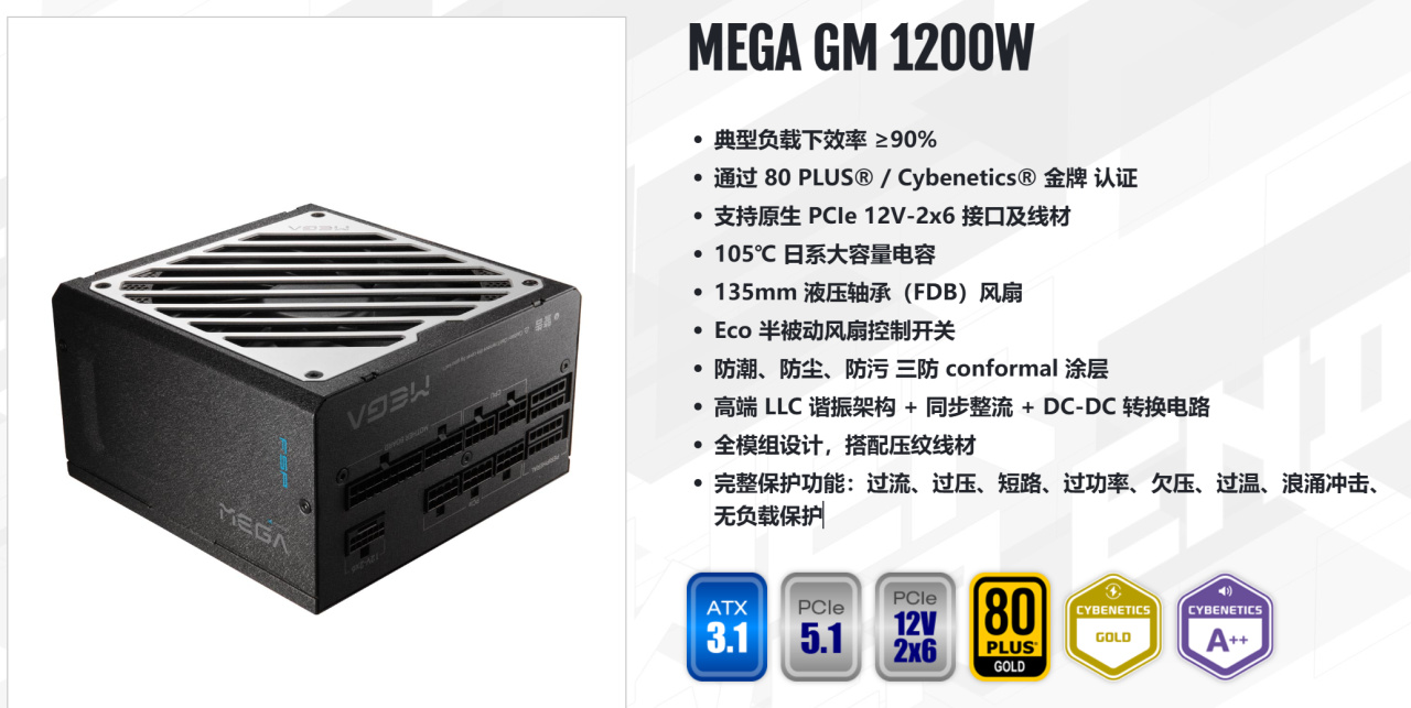 今年年初,全汉正式推出MEGA GM系列旗舰电源,首批提供850W、1000W、1200W三个功率版本(在此之前MEAG Ti钛金就做到了最大1650W功率规格)。