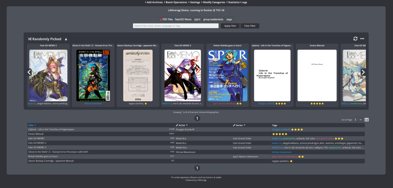 如果说Komga是整理大师,那LANraragi就是极客的玩物。对于有大量同人、扫描版漫画需要归档管理的读者来说,基于Mojolicious+Redis开发的LANraragi比Komga更适合。