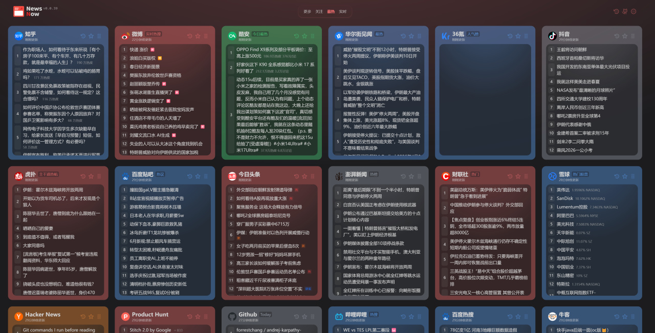 这款由开源社区维护的实时热榜聚合器,能把微博、知乎、抖音、华尔街见闻等17+平台的热搜内容,以极简的界面呈现在眼前,最吸引人的地方在于完全的被动接收——没有智能推荐,没有兴趣标签,只有赤裸裸的全网热点。