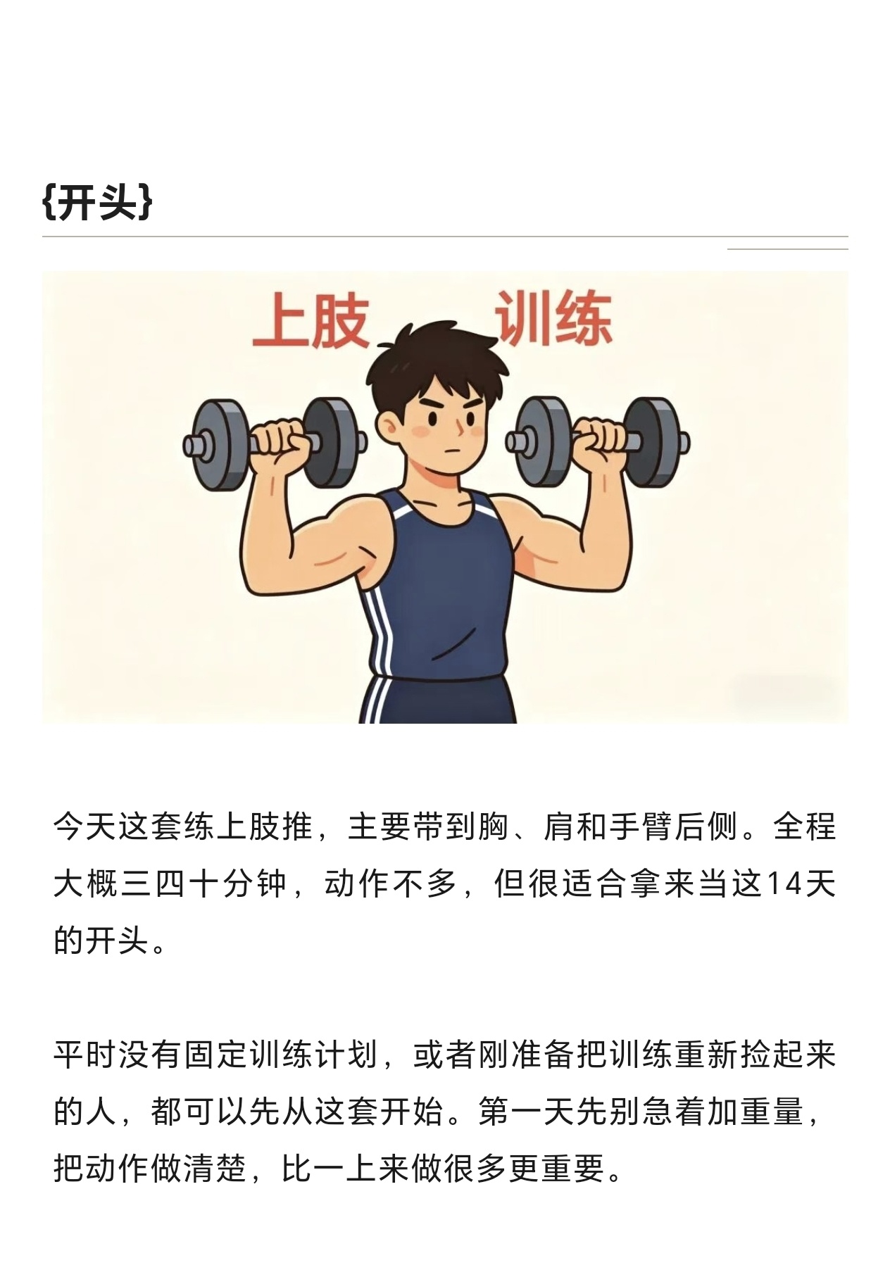 这是《今天练什么》14天框架里的其中一天。这个系列默认按居家可练、器械要求低来安排,重点不是把动作堆满,而是让你今天看到就能开始。你刷到哪篇,就先从哪篇练。