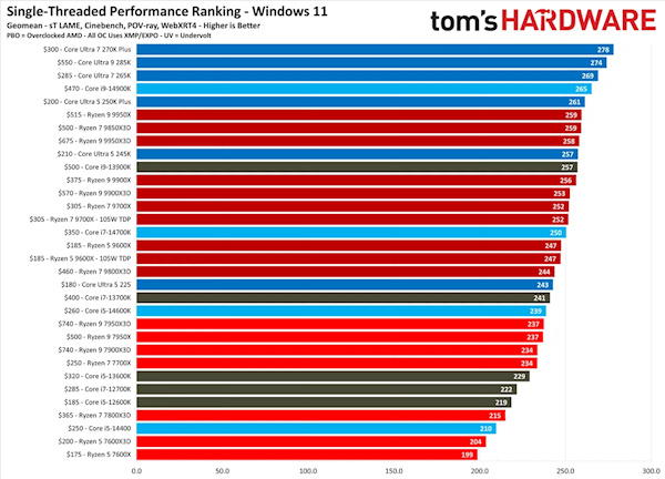 单线程性能上,Intel终于扳回一城,直接登顶。酷睿Ultra7 270K Plus拿下单线程满分,稳坐榜单第一。酷睿Ultra9285K、酷睿Ultra7 265K分列二三位。AMD这边表现最好的是锐龙9 9950X,排在榜单第六,跟榜首的差距其实很小。