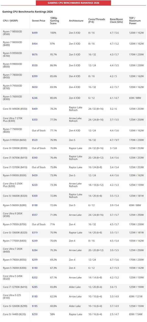 除了三大核心维度,这次测试还覆盖了核显游戏性能,AMD锐龙5000G系列APU依旧是核显领域的领头羊。综合来看,2026年桌面CPU市场的格局已经非常清晰。游戏性能上,AMD Zen5 X3D系列全面领先。单线程性能,Intel酷睿Ultra系列占住了优势。多线程性能,AMD旗舰型号稳坐头把交椅。