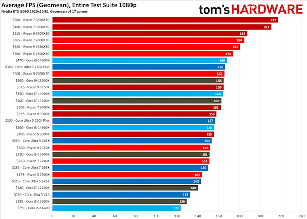 游戏性能这块,AMD直接杀穿了榜单。锐龙7 9850X3D拿下1080p游戏性能榜首,成了目前市面上最快的游戏CPU。这次测试全程搭配NVIDIA RTX 5090FE显卡,测了17款主流3A和电竞游戏,全是高、超高画质设定,最终它的游戏帧率几何均值冲到了217FPS。同架构的锐龙79800 X3D跟得很紧,能跑出它97%的性能表现。
