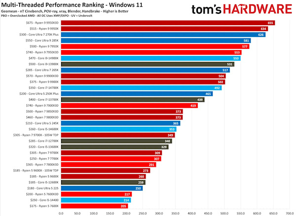 多线程性能这块,AMD又拿回了榜首。锐龙99950 X3D拿下多线程榜第一,锐龙99950X排在第二。酷睿Ultra7 270K Plus位列第三,更关键的是,它的售价只有前两款AMD旗舰的一半,成了高端生产力CPU里的性价比黑马。