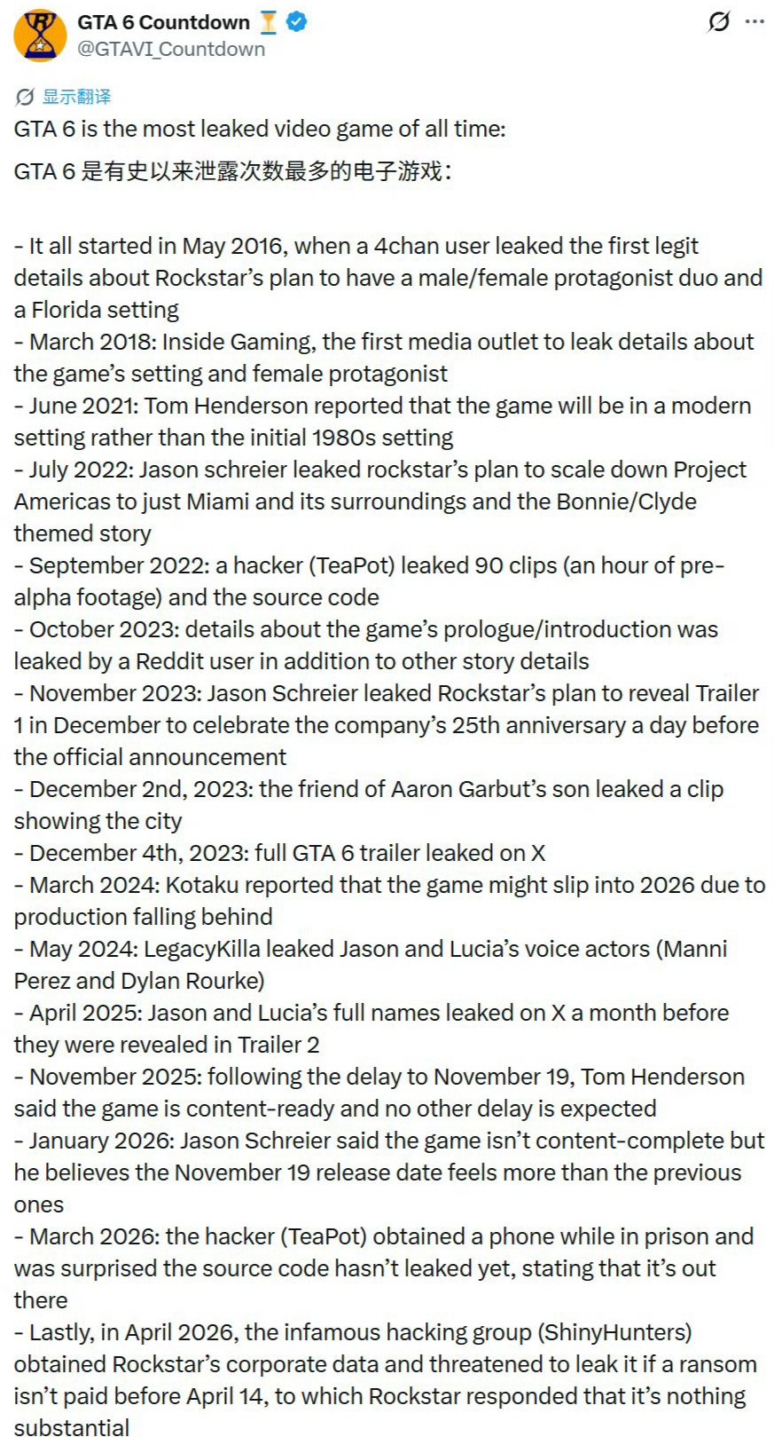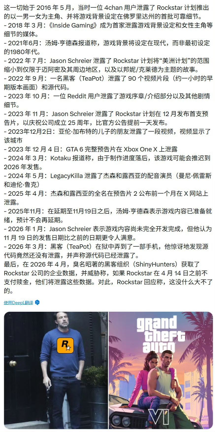 2026年4月,黑客组织ShinyHunters获取R星企业数据,以4月14日为期限索要赎金,否则将公开数据。R星回应称,此次泄露不涉及任何核心重要内容。