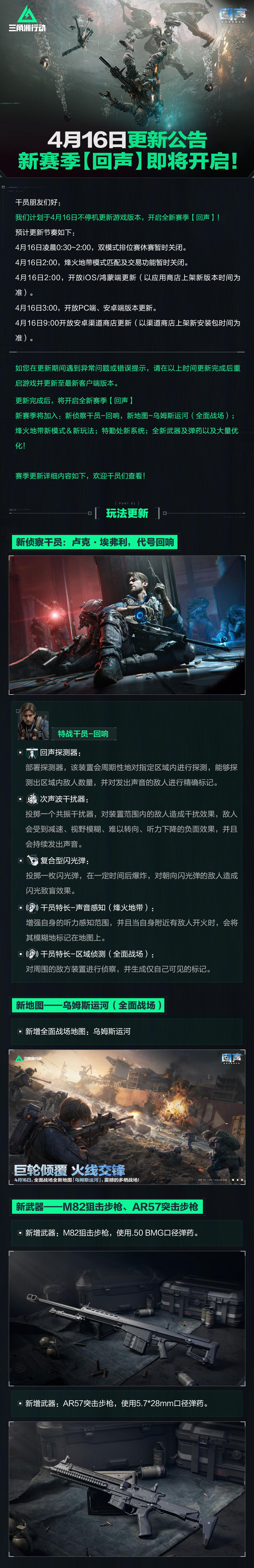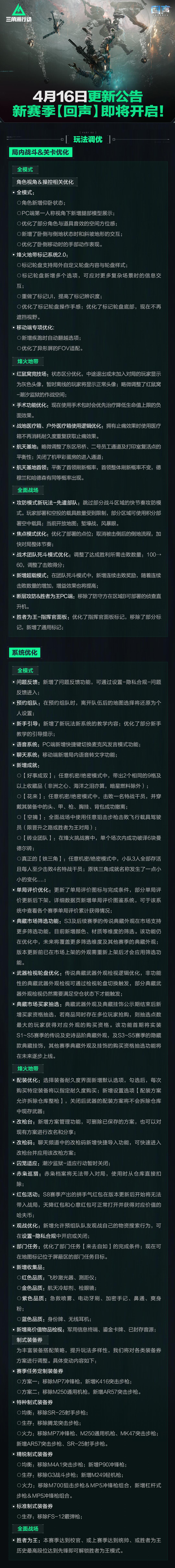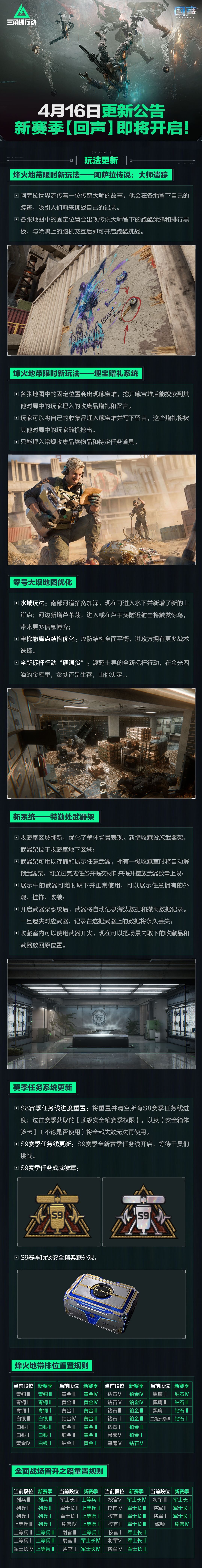 三角洲行动全新赛季「回声」将于4月16日正式上线,那么下面就看看整个S9赛季具体公告里都说了些啥吧。