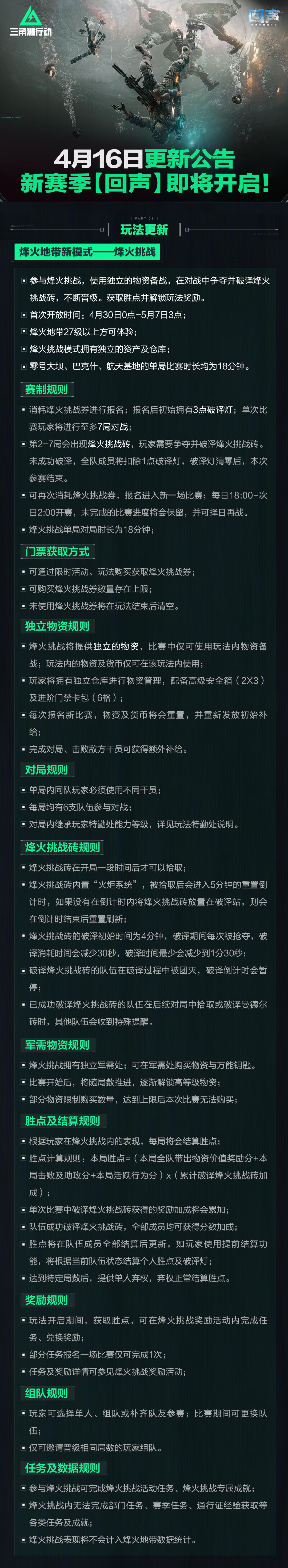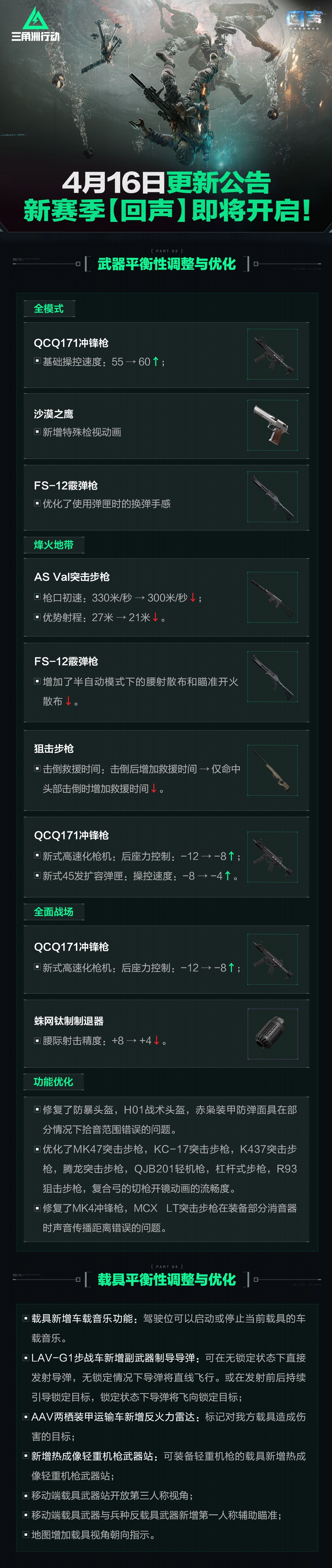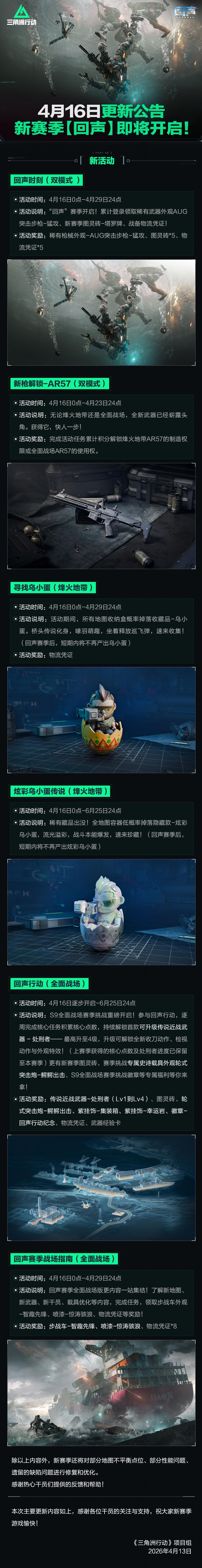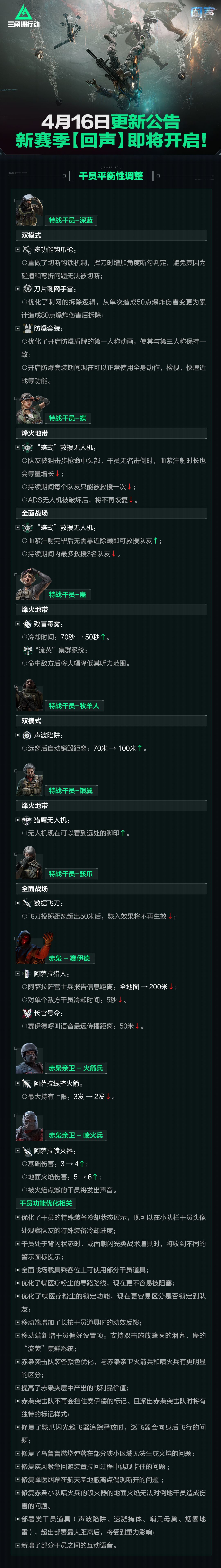 三角洲行动全新赛季「回声」将于4月16日正式上线,那么下面就看看整个S9赛季具体公告里都说了些啥吧。