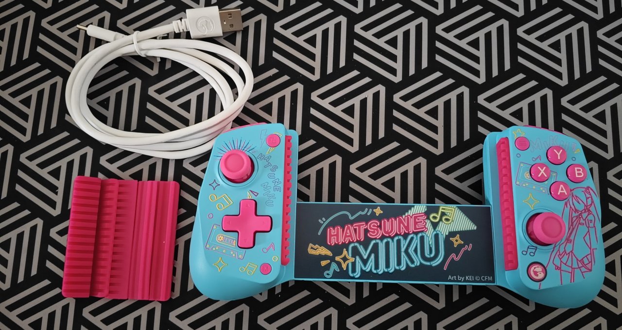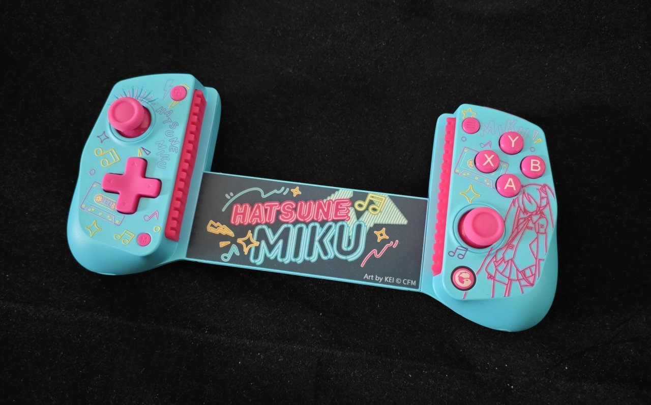 手柄整體配色採用初音未來標誌性的青綠色,上面點綴多種顏色搭配的音樂元素標誌,右側則是紅色的人物剪影,當我們拉開手柄還可以看到Hatsune Miku的字體,按鍵佈局則是與joycon類似。夾持的兩側則是選用硅膠墊,在提高穩固性,同時標配了7種不同的硅膠墊可供選擇。作爲拉伸手柄並沒有採用Type-C口連接,則是選擇藍牙5.3和2.4G接收器兩種連接方式,其中接收器需要我們單獨購買。