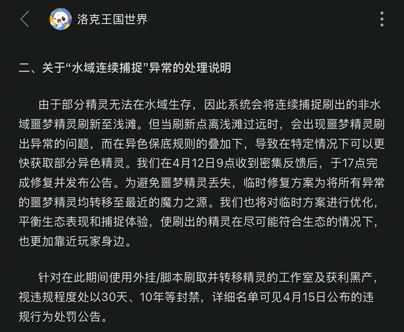 昨天的异色bug闹得沸沸扬扬,洛克王国经过了一天多的思考终于在刚才正式回应,表明自己与黑产势力绝不妥协,对于利用bug恶意刷取的工作室、脚本封禁