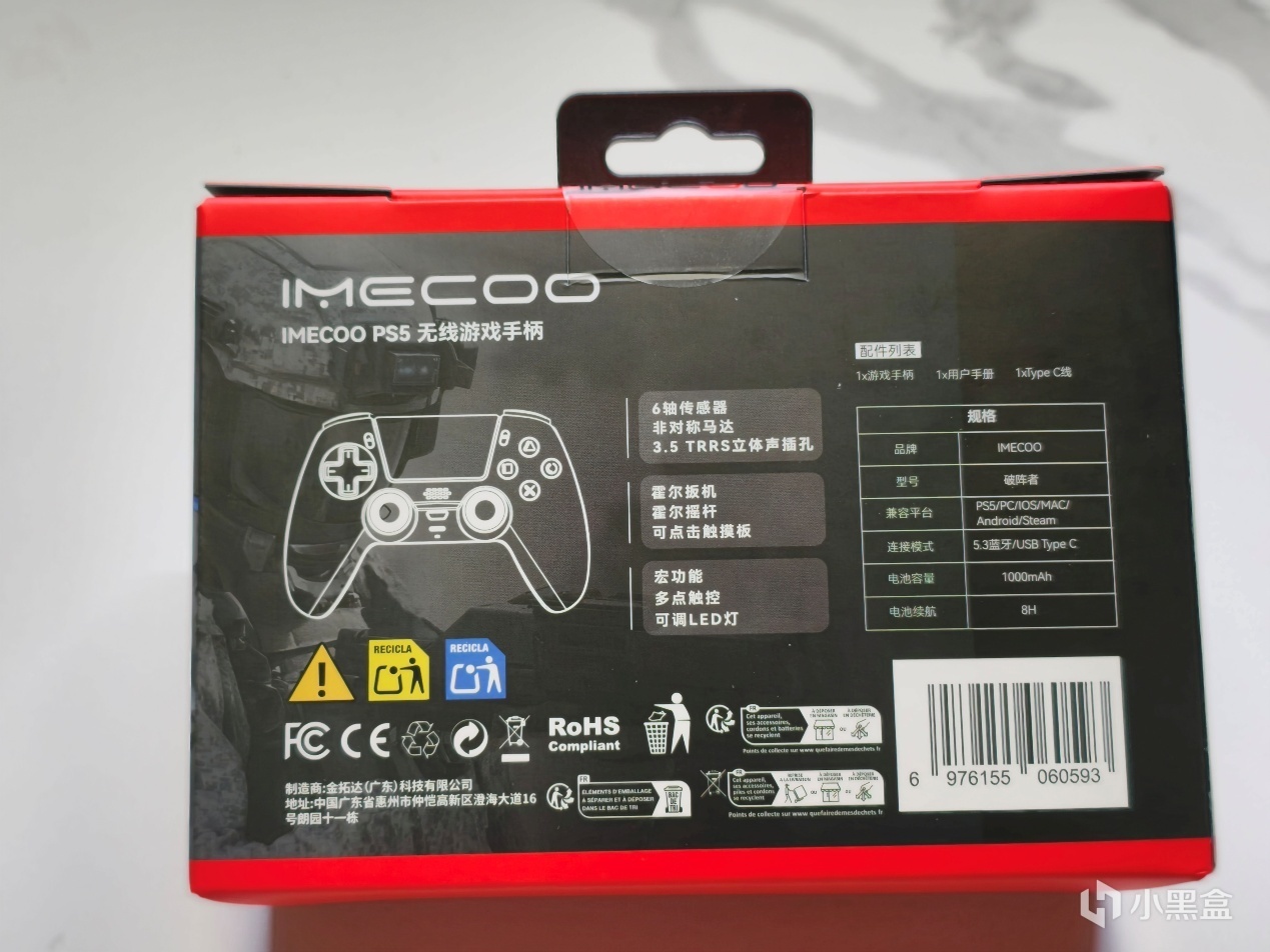 本次的包装以红白为主色调,正面印有破阵者的实体图案,虽然没有什么奢华感,但胜在简单明了。背面则是详细说明了手柄的各类特征,比如什么6轴传感器,非对称马达,立体声插孔以及DualSense没有的霍尔扳机等特征。