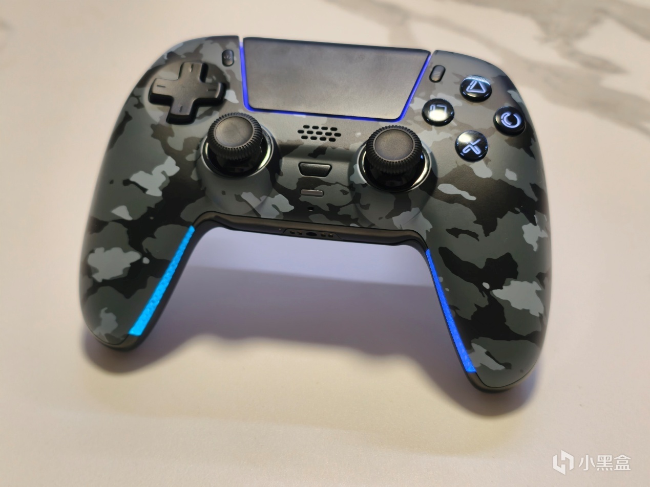 先看正面,作为DualSense的平替品,破阵者基本就是照着DualSense的模子刻出来的,标准的对称式摇杆布局,就是你平时用惯了DualSens手柄,上手不会有任何违和感,甚至在重量以及握持感上都相差无几。相比于DualSens最大的变化就是在两个内握把处即△□×○键处加入了RGB 灯带, 正前面的Logo也换成了魅谷自家的标志。