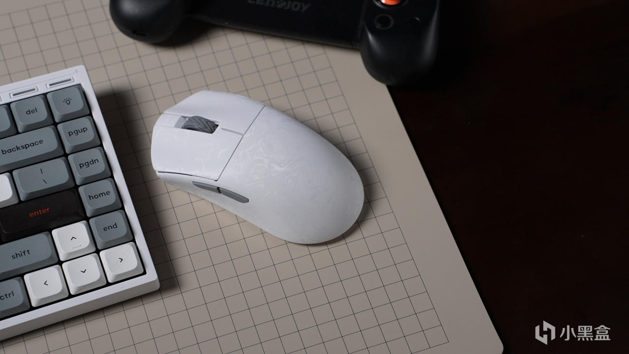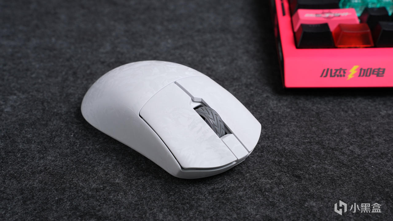 表面通过特殊处理有类似于锻碳纹的纹理,摸起来是类磨砂质感,可以起到防滑的作用,白色的鼠标纹理不是那么强,另一款黑色的纹理会更明显一些。