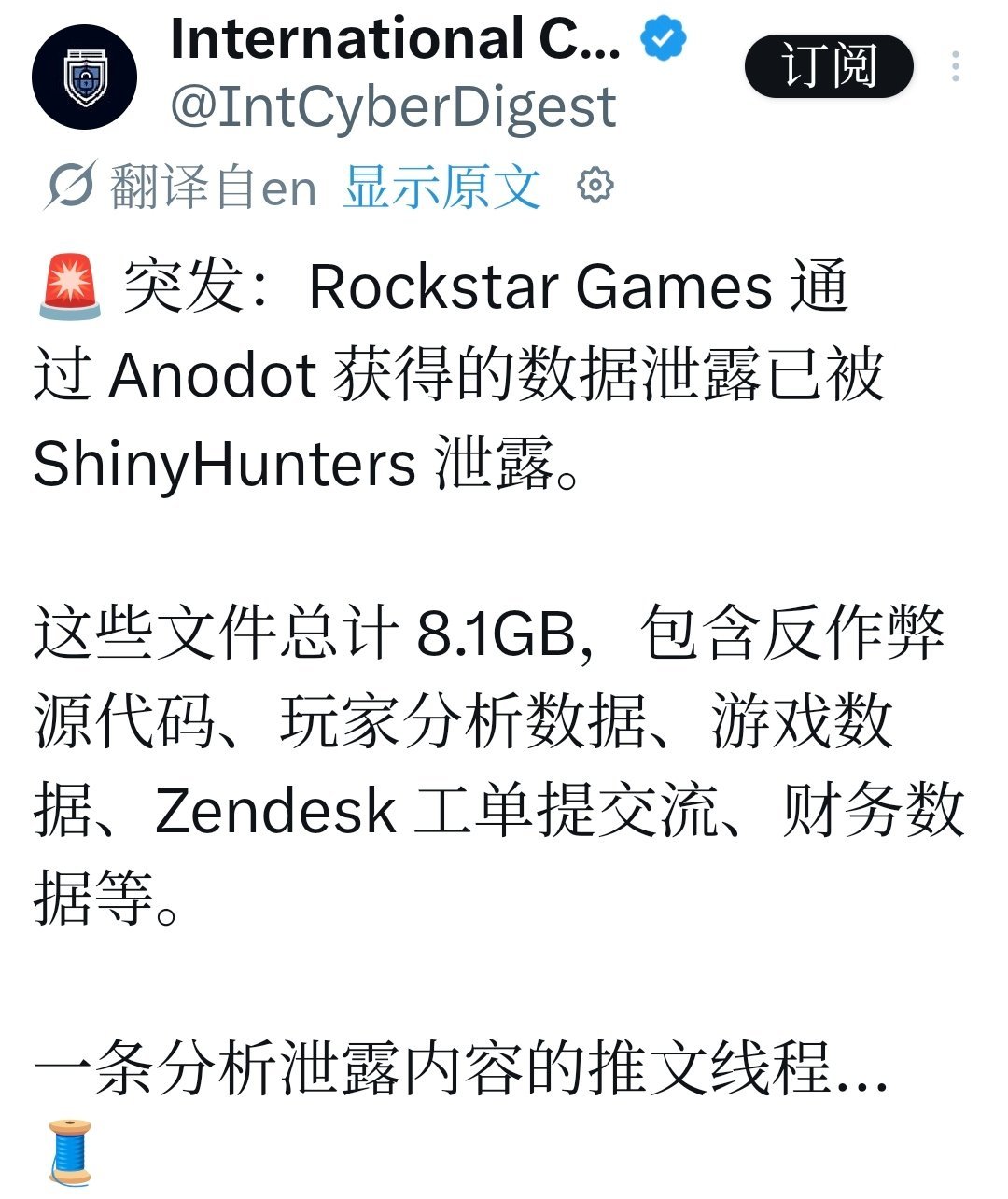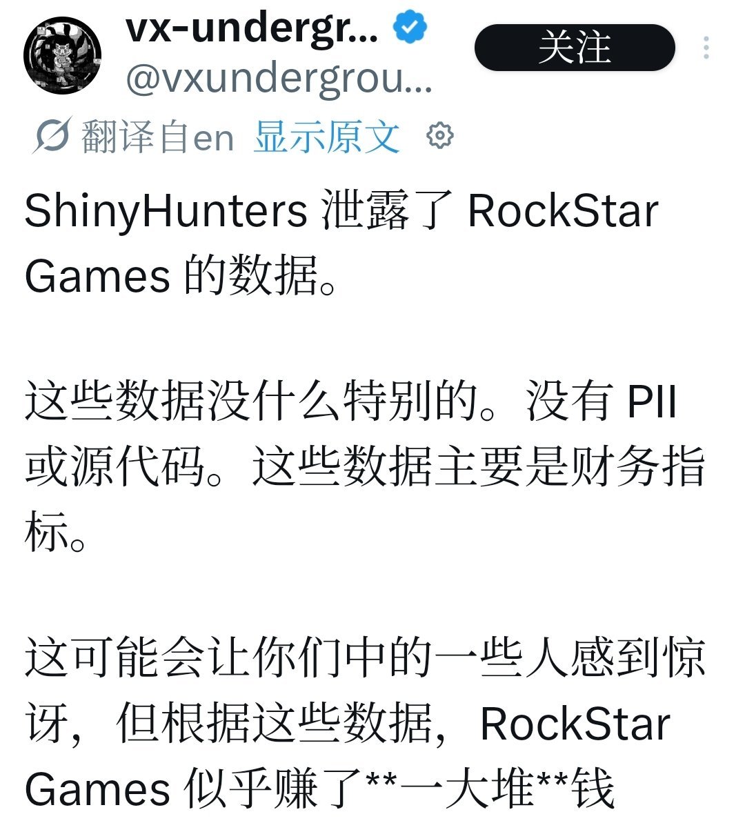 R星迅速向多家媒体发出简短声明:“我们确认,一起第三方数据泄露事件导致有限数量的非实质性公司信息被访问。此次事件对我们的组织或玩家没有任何影响。”这与黑客发布的信息完全吻合——纯营收指标,对游戏开发、运营和玩家体验确实没有实质损害。