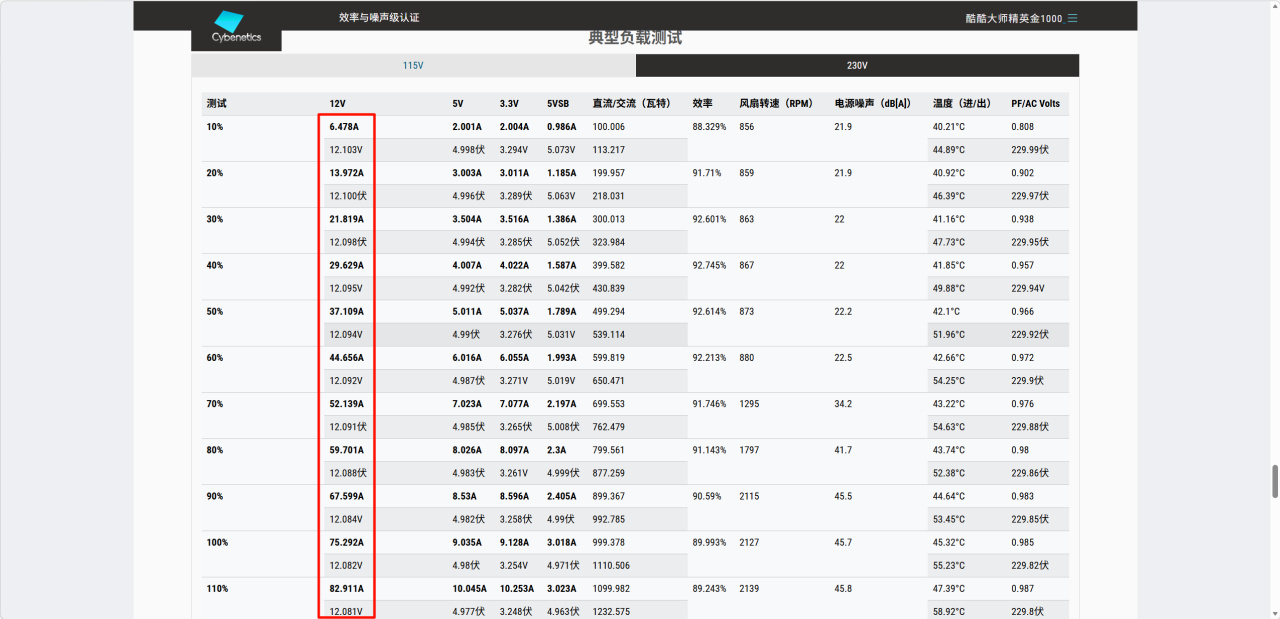 Cybenetics给到的测试数据显示GX GOLD 1000W从10%-100%负载下的+12V电压偏离度控制在≤1%,说明这款电源的电压稳定性很不错。