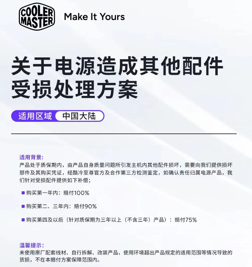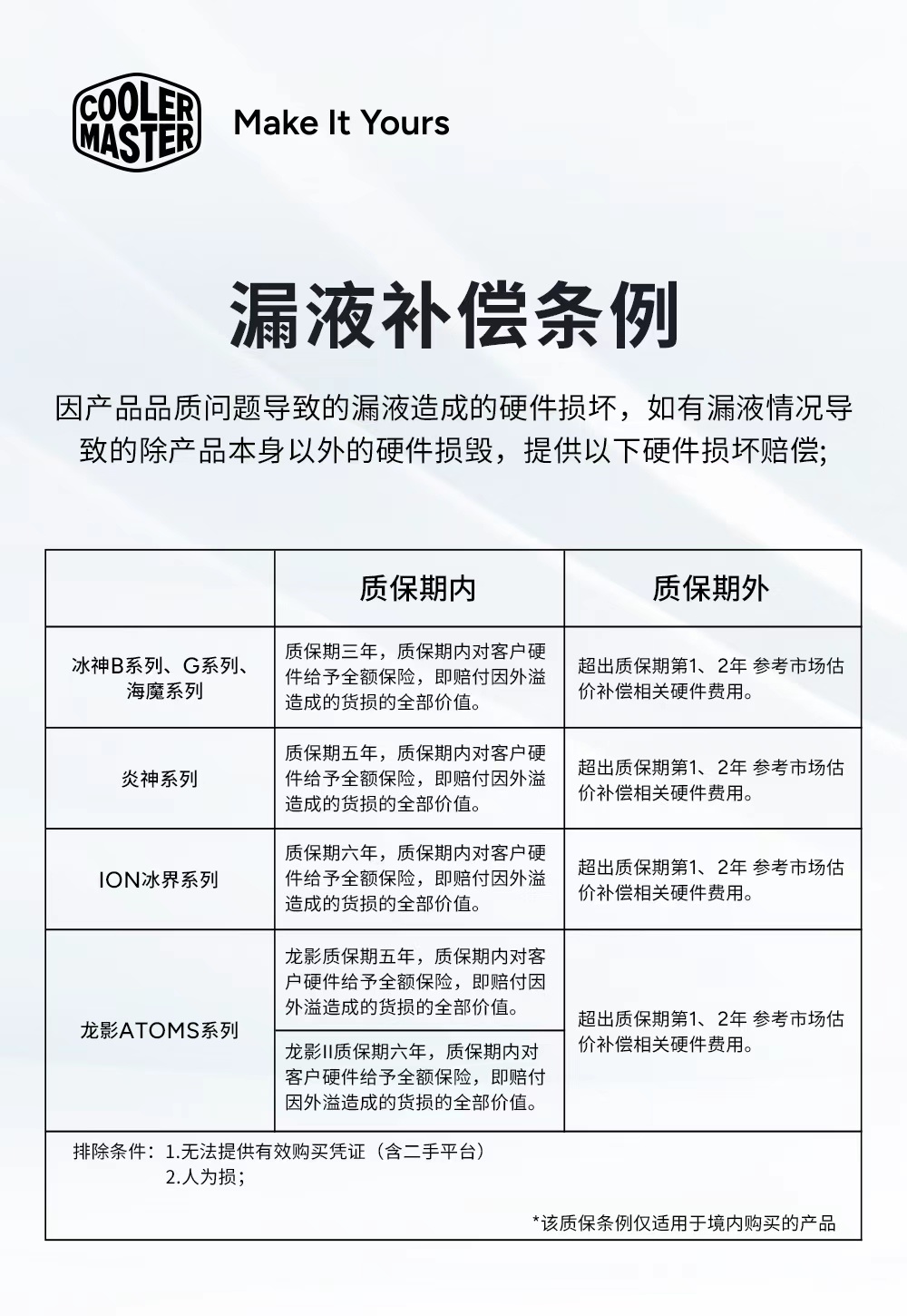 既然说到水冷那就聊聊酷妈的水冷质保政策,它不是目前市面上水冷赔偿递减的政策,在质保年限内出现因水冷造成的硬件损坏,全额赔偿,甚至还有保外再佩服两年的政策,挺不错的。