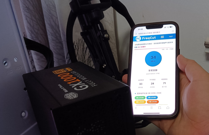 低负载下风扇转速很低,几乎听不到风扇声;CPU和显卡双烤满负载下风扇转速上来了,用手机简单测得噪音在34dB左右,人耳的安静环境基准约为30dBA,凑近了听才能听到。正常使用电脑,电源风扇声会被水冷风扇和机箱风扇的噪音给覆盖掉了。