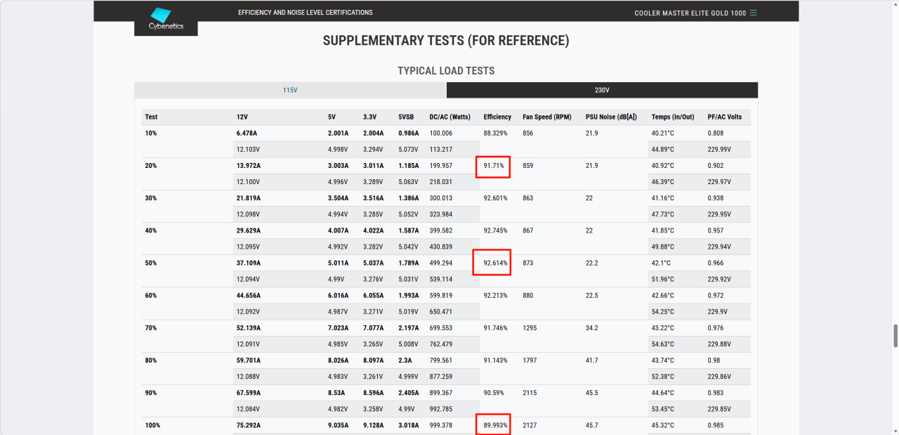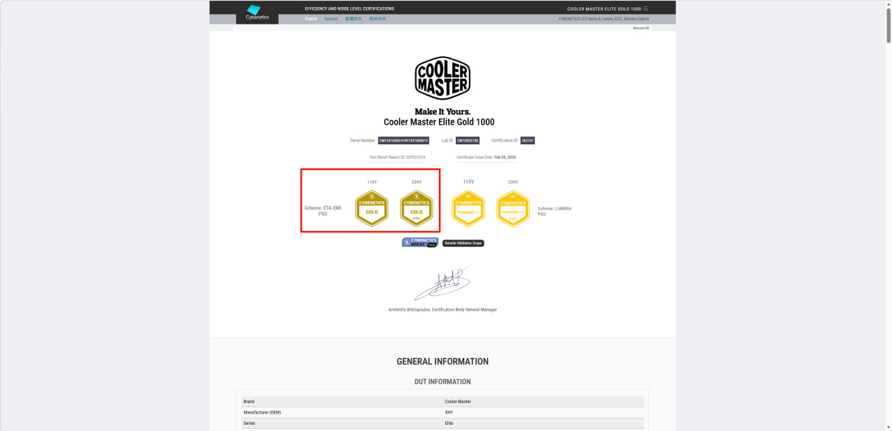 酷冷至尊GX GOLD 1000W有获80 PLUS和Cybenetics双金牌认证,Cybenetics金牌认证的含金量不用多说,它是目前最权威的第三方电源检测机构,80 PLUS只测3个负载点的效率;而Cybenetics测全负载区间+噪音+待机+PF+电压稳定性,测试要比80 PLUS更全面、更严苛。