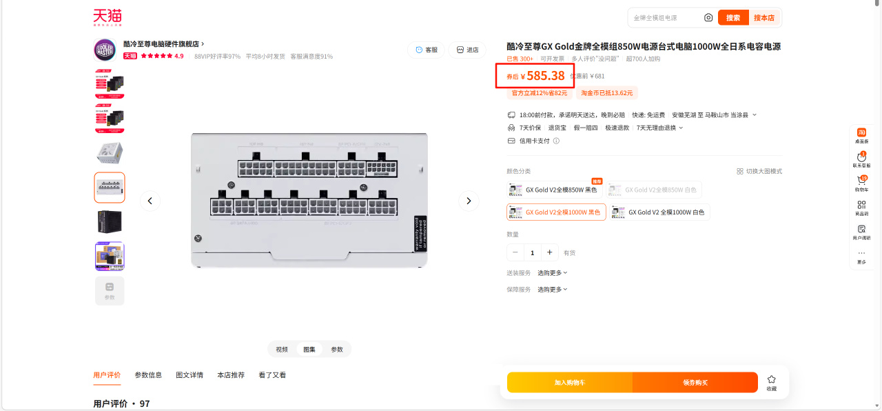 前段时间他让我帮他整理些1000W的电源让他挑,后面他自己选中了一款性价比很高的电源——酷冷至尊GX GOLD金牌全模组1000W,全日系电容目前只要585.38¥。