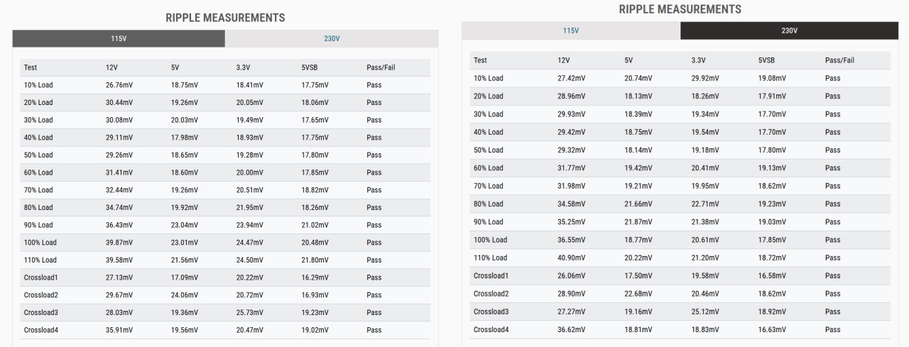 115V和230V下满载+12V纹波控制的很优秀,符合好电源纹波“115V满载<50mV,230V满载<40mV”这个区间,能保证电脑不会出现死机、花屏等情况。