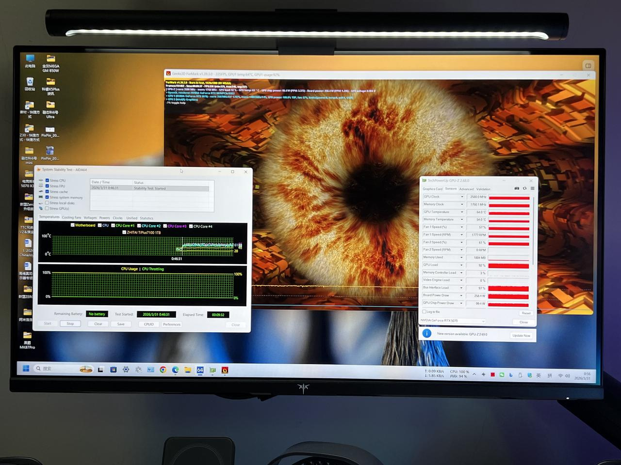 稳定性测试这块,简单给显卡和CPU上点压力,双烤了一段时间,整个过程很稳定,没出现黑屏、机器重启的情况,而且后续我从下午两点玩到晚上八点的《黑神话:悟空》,没有出现任何游戏闪退、黑屏的情况,GX GOLD 1000W的稳定性不用担心。