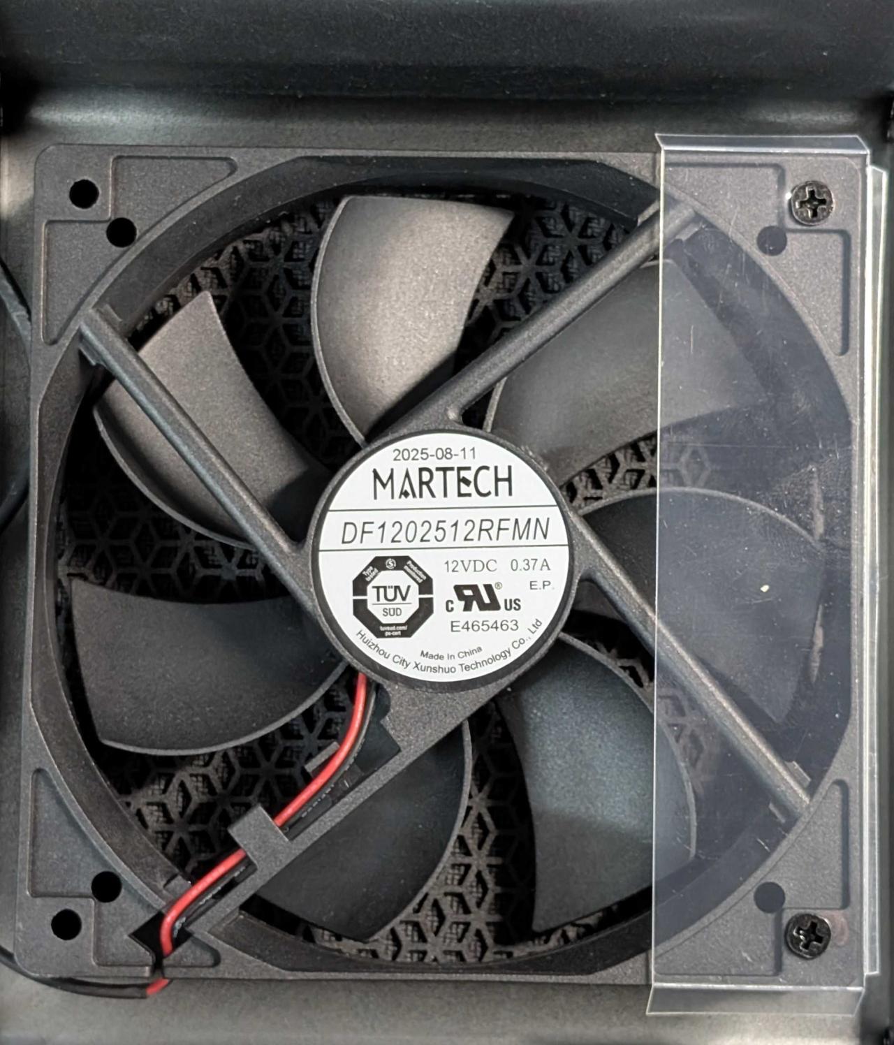 风扇格栅下面是一颗120mm的HBD液压轴承智能温控风扇,来自讯硕,配有透明扰流片,最高转速能来到2200转,比较可惜的是没有0转速启停功能,也就意味着电脑在极低负载下风扇仍会转,噪音这块后面实测会说到。