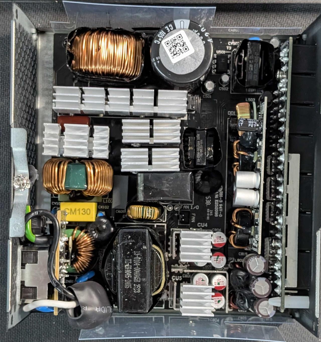 电源的内部架构采用的是主动 PFC+全桥 LLC谐振+同步整流+DC-DC的这么一套架构,支持单路+12V输出设计。这款电源就像我前面说到的,它是你目前能买到的价位最亲民的全桥1000W金牌电源,相比于半桥,全桥在电源转换效率上有一定优势。
