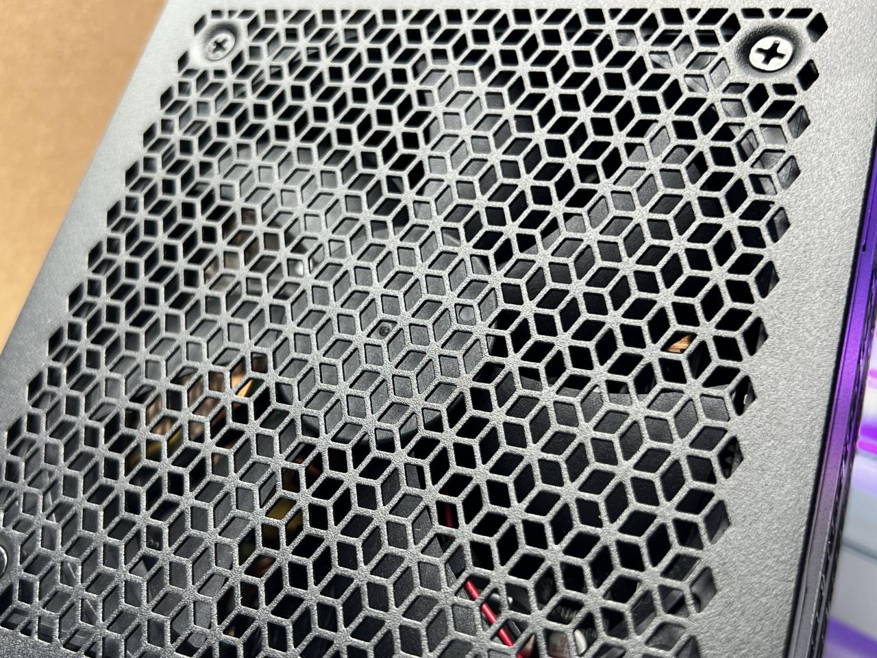 风扇格栅是酷妈家标志性的格栅造型,由平行四边形组成的六边形格栅孔,也是借鉴了自家品牌LOGO的形状,在一些环境比较苛刻的地方,能阻挡一些昆虫。不过这个风扇格栅和电源外壳是一体的,强迫症玩家后续想拆开清灰有点不太可能了。