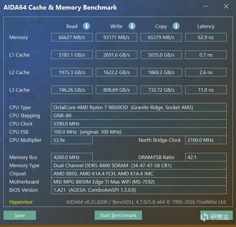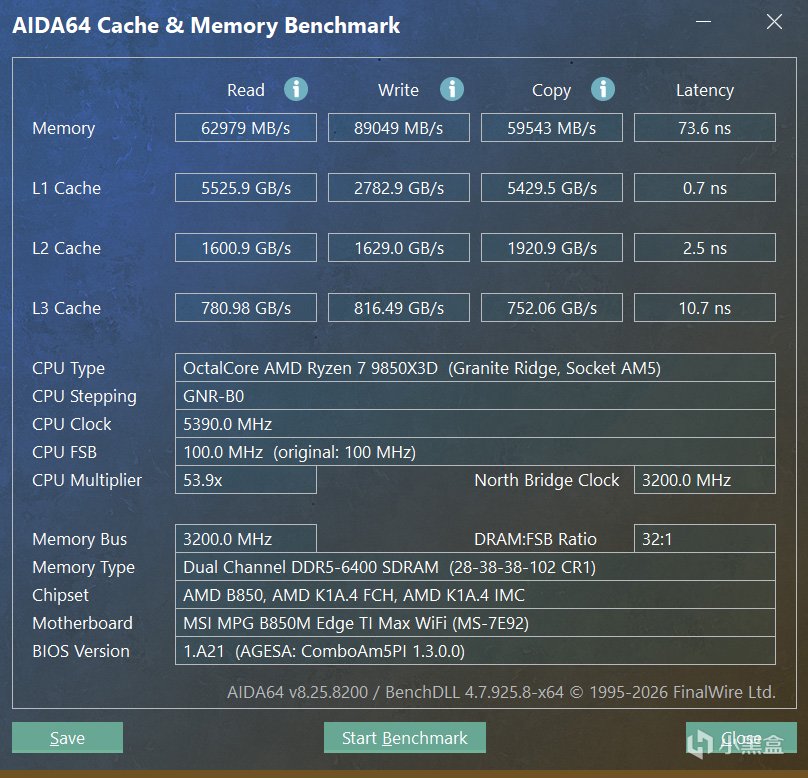 AIDA64内存和缓存测试,开启DDR5 6400C28的EXPO配置+FCLK 2133MHz,锐龙7 9850X3D读取性能为62979 MB/s,写入性能则为89049 MB/s,复制性能达到59543 MB/s,内存延迟为73.6 ns,延迟可比一般6000C30 EXPO配置低不少。