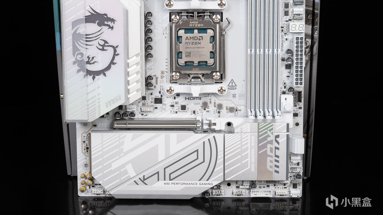 微星B850M刀锋钛基于标准MATX规格打造,它采用纯白主题设计,并全方位覆盖PCB和各类插槽,属于真正意义的纯白,除此之外还有大面积斜纹、龙纹LOGO、镜面区域等丰富元素加持,整体颜值和质感拉满,简单来说,它无疑非常适合紧凑&纯白海景房装机方案。