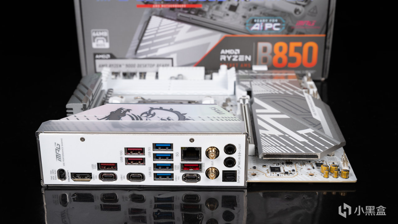 微星B850M刀锋钛后置I/O接口&配置一览,从左往右分别是Clear CMOS、Flash BIOS、HDMI 2.1、4*USB 10Gbps Type-A、3*USB 10Gbps Type-C、4*USB 5Gbps Type-A、5G LAN有线、Wi-Fi 7无线和三组音频接口(ALC4080高端音频芯片)