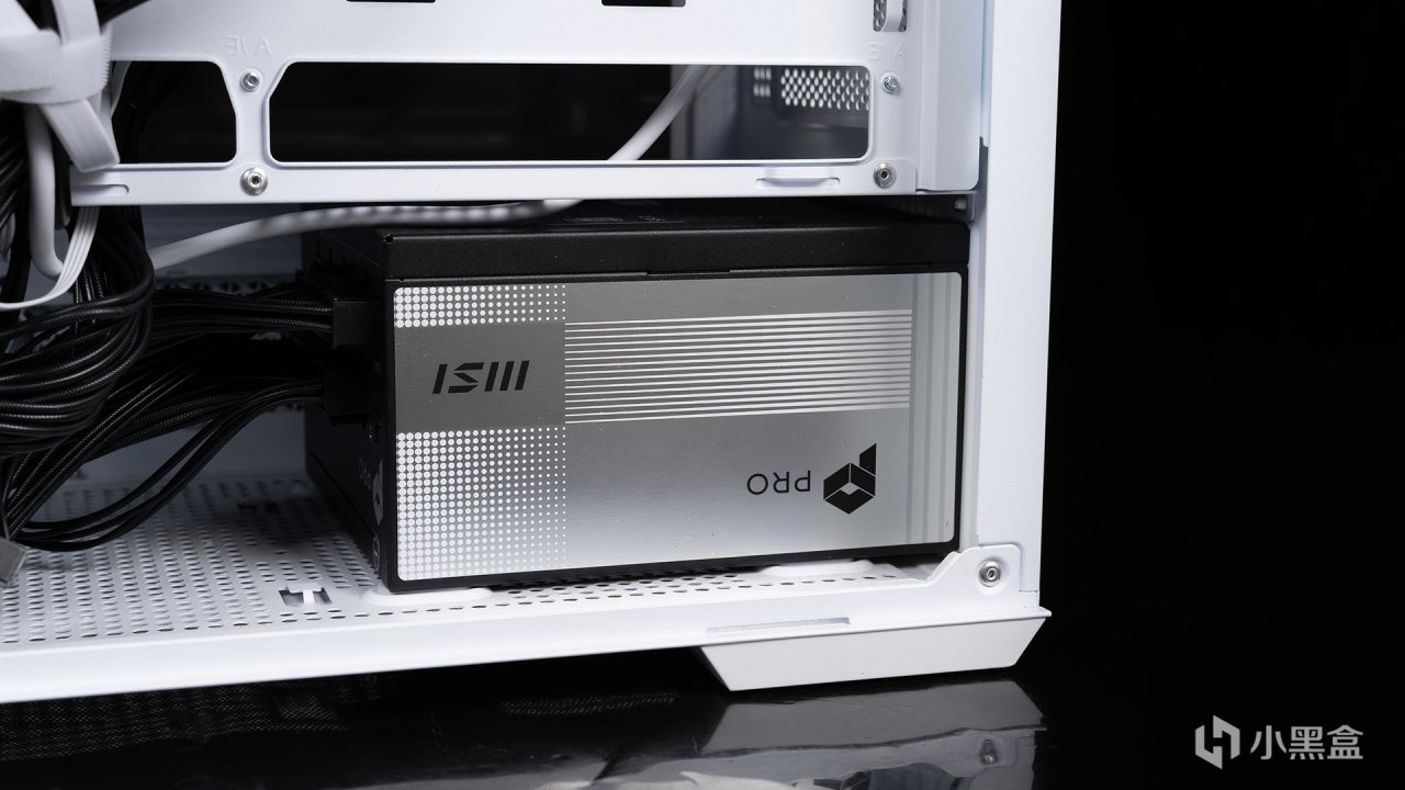 搭配显卡是高端显卡,因此电源也采用了微星PRO A1000PL PCIE5,它拥有银色金属质感侧面板更凸显“PRO”质感,它还是一款ATX 3.1& PCIe 5.1规范产品,且转换效率达到了80PLUS白金认证级,拥有原生12V-2x6接口,最高可为显卡提供600W,接口部分采用了特别的异色设计,方便用户判断接口是否插牢,电源支持十年质保售后和贴心的赔付政策。