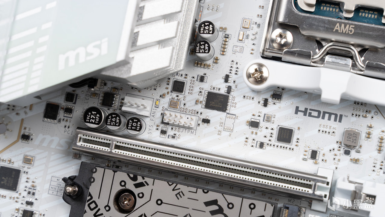 扩展槽方面,微星B850M刀锋钛只配备了一根Lightning GEN 5 PCIe显卡插槽,并支持显卡快拆,下方空间则全留给了一体式的M.2冰霜铠甲,这样的布局其实相当合理,符合大多数用户的使用需求。