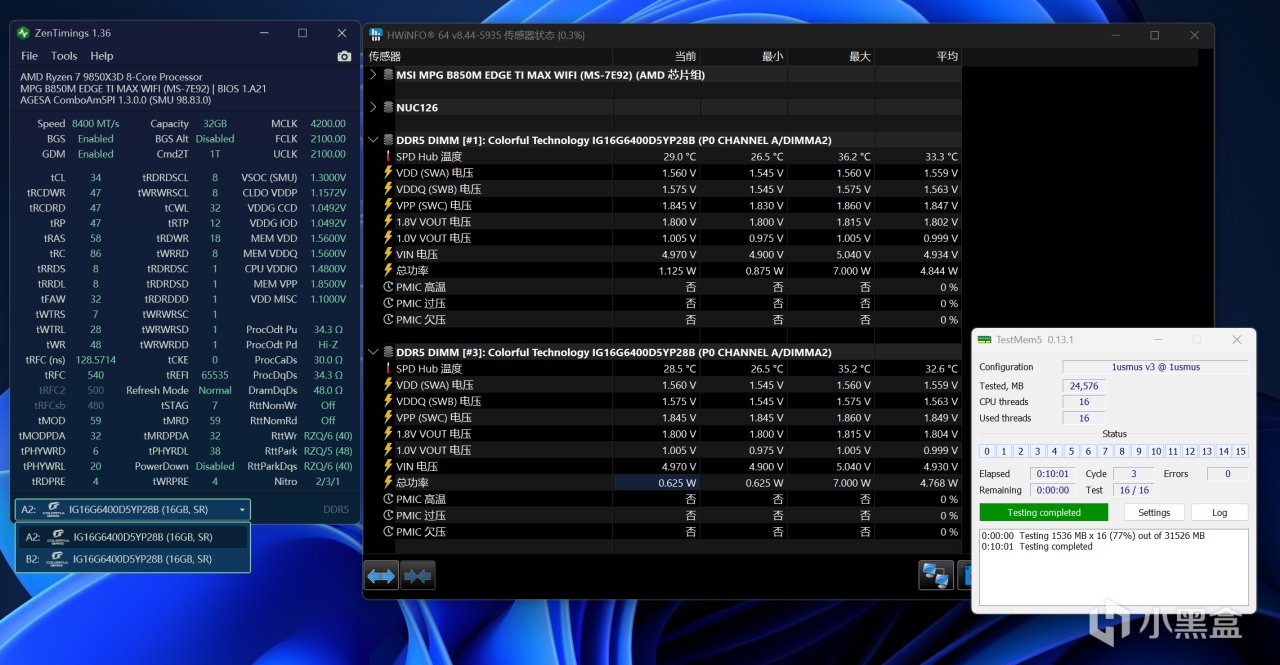 微星B850M刀锋钛作为常规四槽MATX主板,内存超频能力同样不俗,这颗锐龙7 9850X3D经一番操作后能超频至DDR5 8400C34-47-47-58,副时序和第三时序也能进一步优化参数,FCLK频率同步至最优2100MHz,这样调教下VDD和VDDQ电压仅需1.56V就可达成,当然烤机过测测TestMem5 1usmus V3项目是需要风扇辅助直吹内存马甲的。