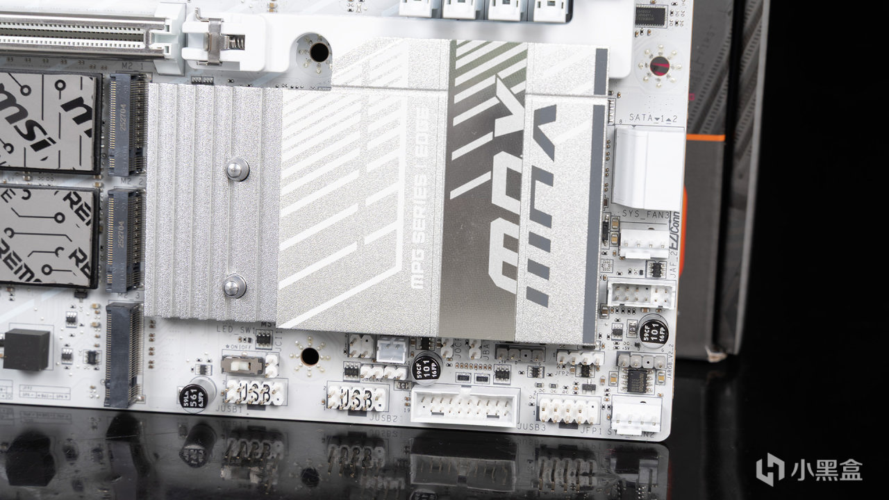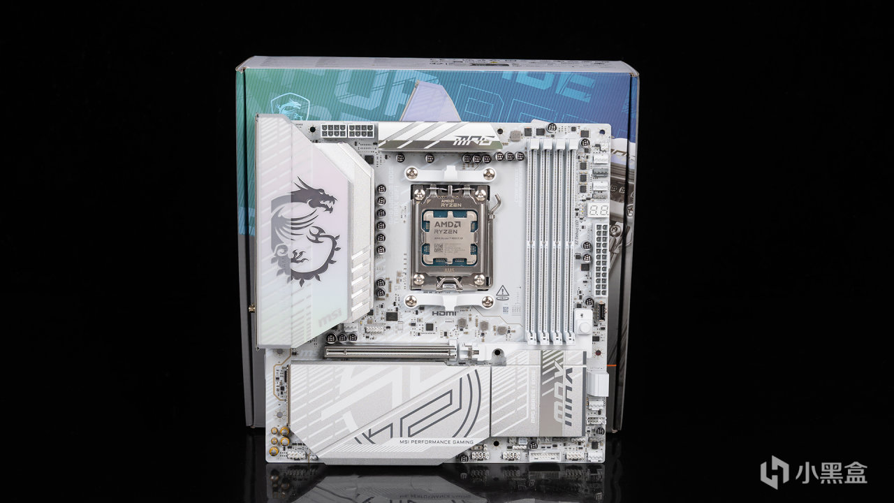 微星B850M刀锋钛整板唯一灯效就位于I/O装甲上的龙纹LOGO灯,值得一提的是,一部分通过磨砂透明盖板来呈现朦胧的视觉效果。