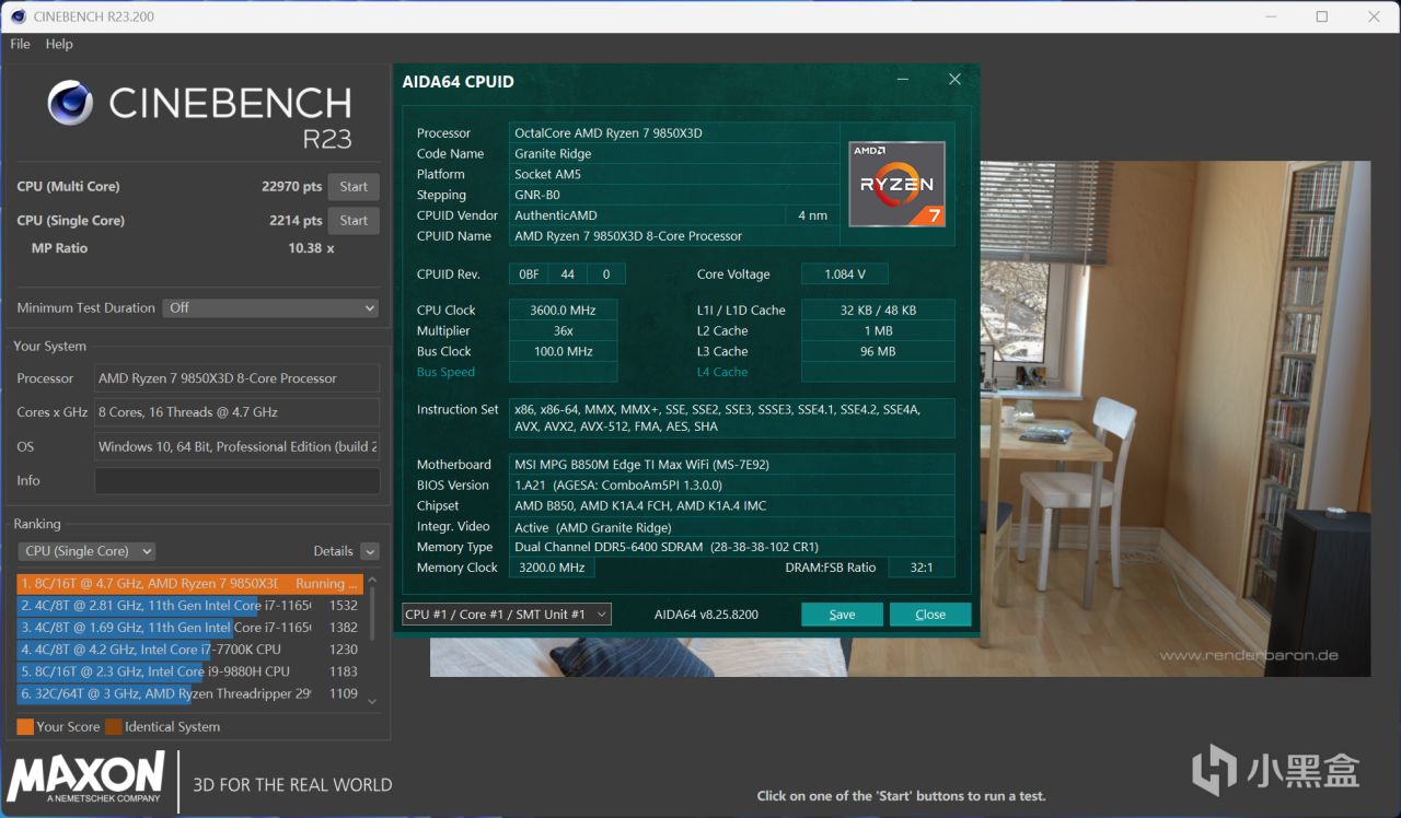 锐龙7 9850X3D在CINBENCH R23中多核得分为22970 pts,单核则达到2214 pts,从得分来看,微星B850M刀锋钛已经是充分发挥CPU的极致性能,多核跑分基本和9700X是一致水平,而单核跑分则略高于9700X。