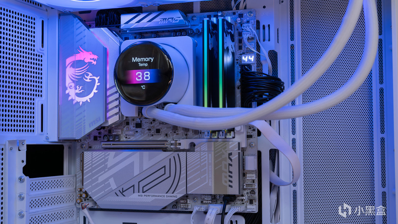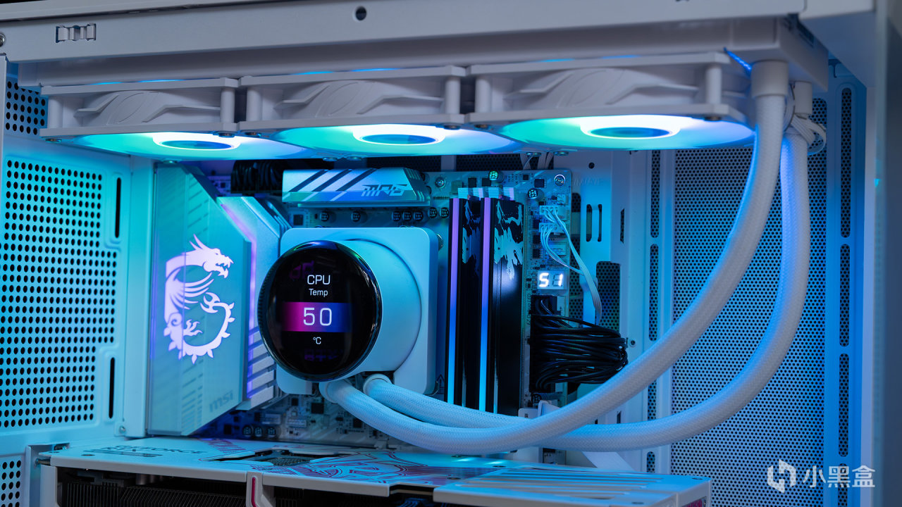 为了更好压制锐龙7 9850X3D,CPU散热器使用了微星MPG CORELIQUID P13 360 WHITE冰曜,它在冷头上采用了曲面玻璃细致工艺,配备一块2.1英寸LCD屏幕,支持实时监控硬件、视频播放、系统时钟、副屏扩展等功能,它还拥有复合扣具、无螺丝全铜底、磁吸式盖板、JAF一线链接等设计卖点。