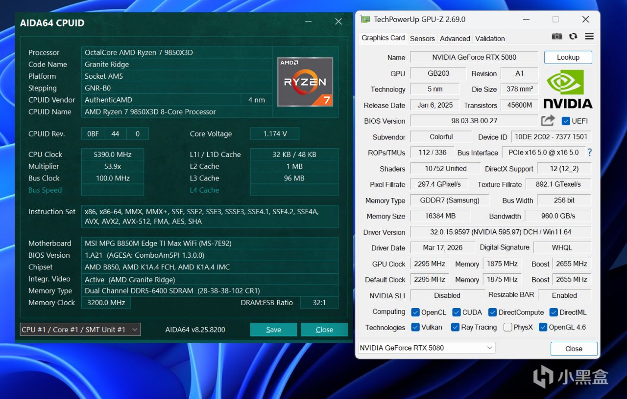 整体配置和环境简单介绍一下,CPU就是锐龙7 9850X3D,设置开启PBO ENABLE档,搭配DDR5 6400C28 16GB*2内存套装开启EXPO,操作系统是Windows 26H1最新版本,显卡驱动则是NVIDIA GameReday 595.97 WHQL最新版本。