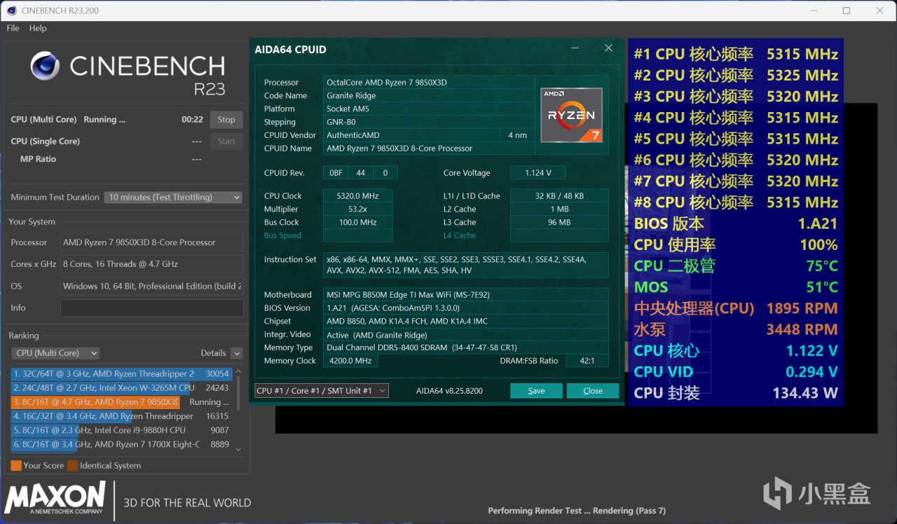 CINBENCH R23十分钟多核循环烤机测试,这里还简单设置了PBO 2(负压30、10X),锐龙7 9850X3D二极管最高温度仅为75℃,主板MOS最高温度则是51℃,CPU封装功耗则是134W,CPU风扇最高转速为1895RPM,散热器和主板均能轻松带动。