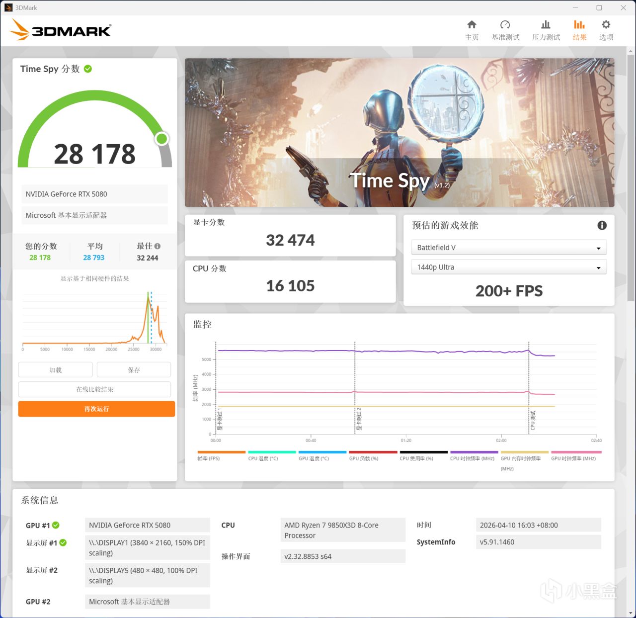 X3D处理器搭配高端显卡已成常态化现象,在3DMARK Time Spy项目中,锐龙7 9850X3D得分16105,RTX 5080显卡分数32474,显卡性能得以发挥完全。