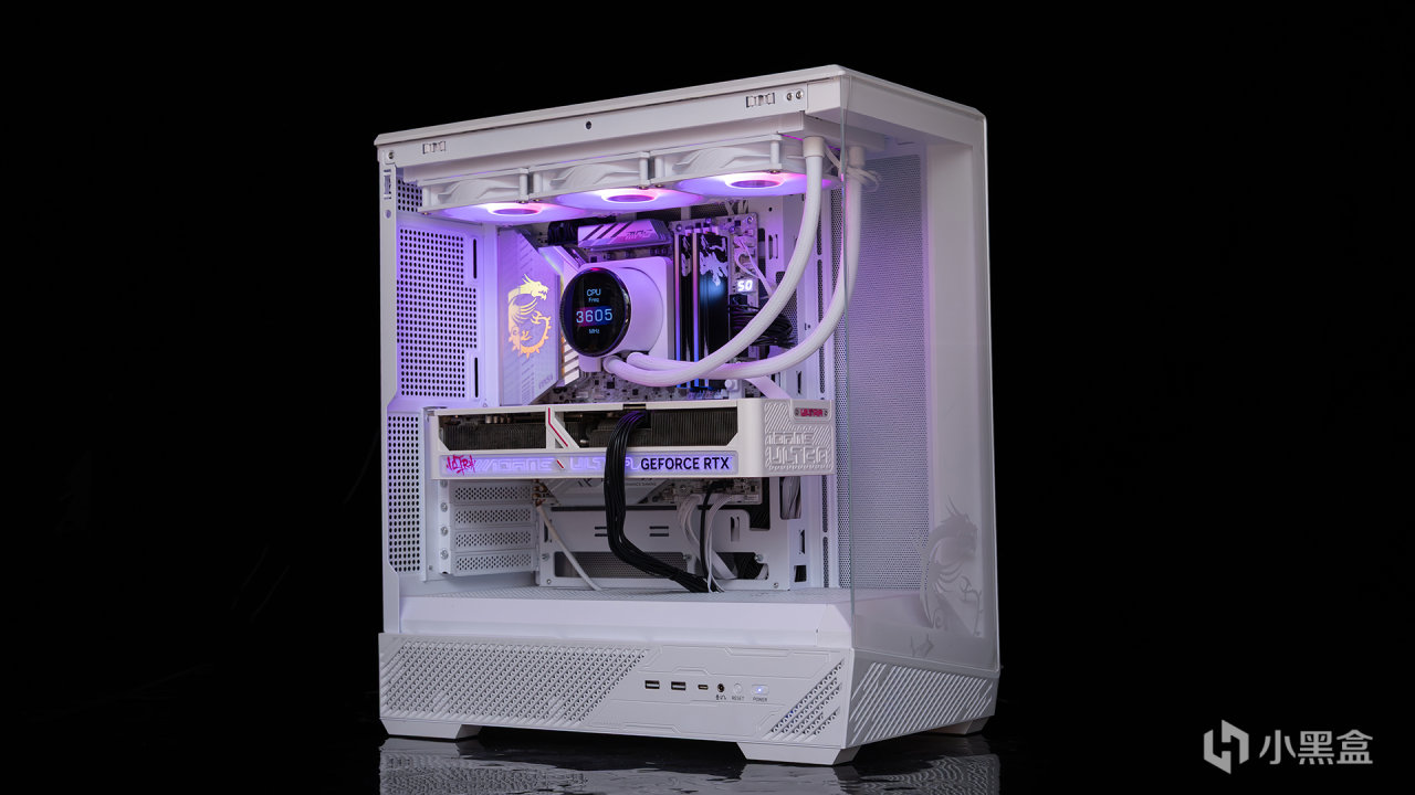 本次也是直接搭建整机进行测试,方便给大家参考一下,机箱也来自于微星的MAG PANO 131L PZ WHITE白龙,它属于常见的钢化玻璃侧透海景房设计,但对箱体进行了增强散热风道优化——底部区域布置了散热孔,内部支持双360水冷并兼容背插主板,机箱I/O位于侧下方,包括一组前置20Gbps Type-C接口,能满足高端主板的扩展需求。