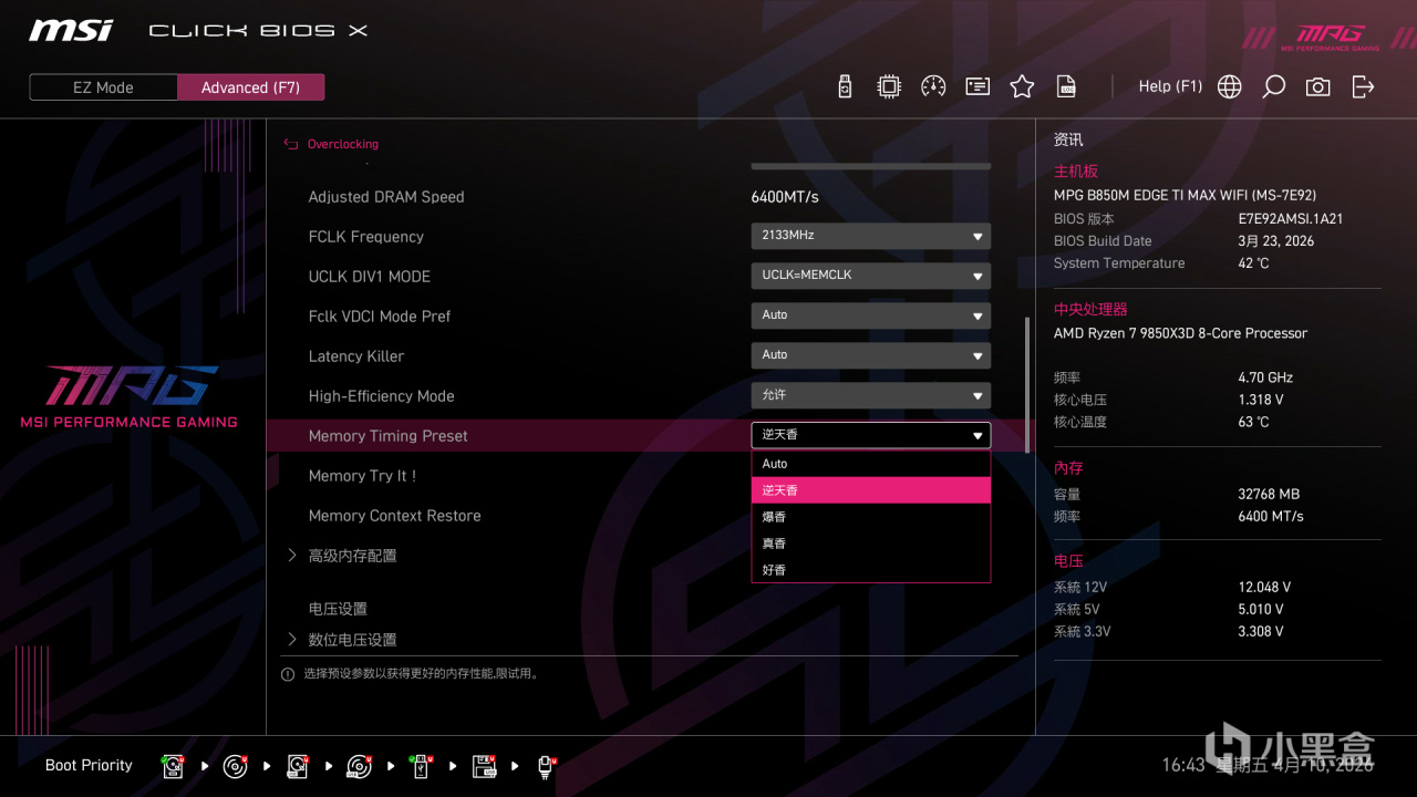 在进阶界面里,Memory Try It!、High-Efficiency Mode、Latency Killer功能一应俱全,其中开启High-Efficiency Mode后,在Memory Timing Prest选项下就能提供逆天香、爆香、真香和好香四个优化档位——自动帮你完成小参调教,提升内存性能。