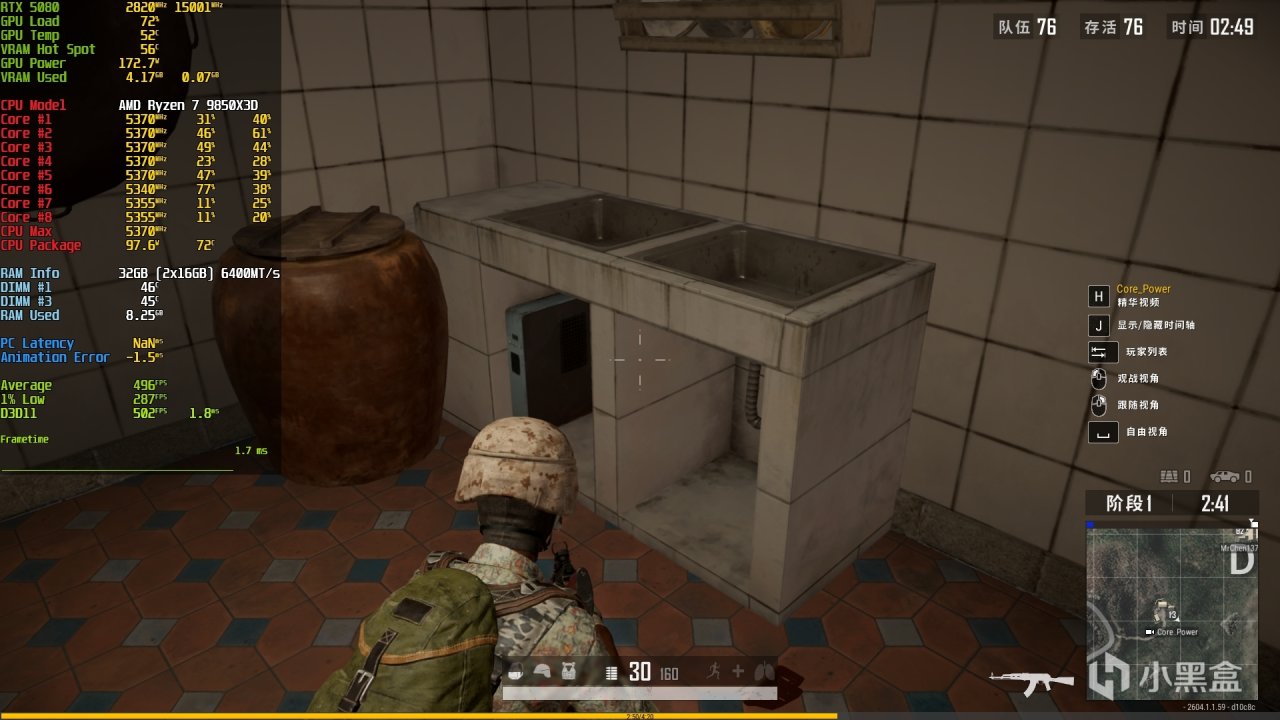 《绝地求生》自定义三超高,锐龙7 9850X3D+DDR5 6400C28+RTX 5080平均帧数为496fps,1% LOW帧为287fps