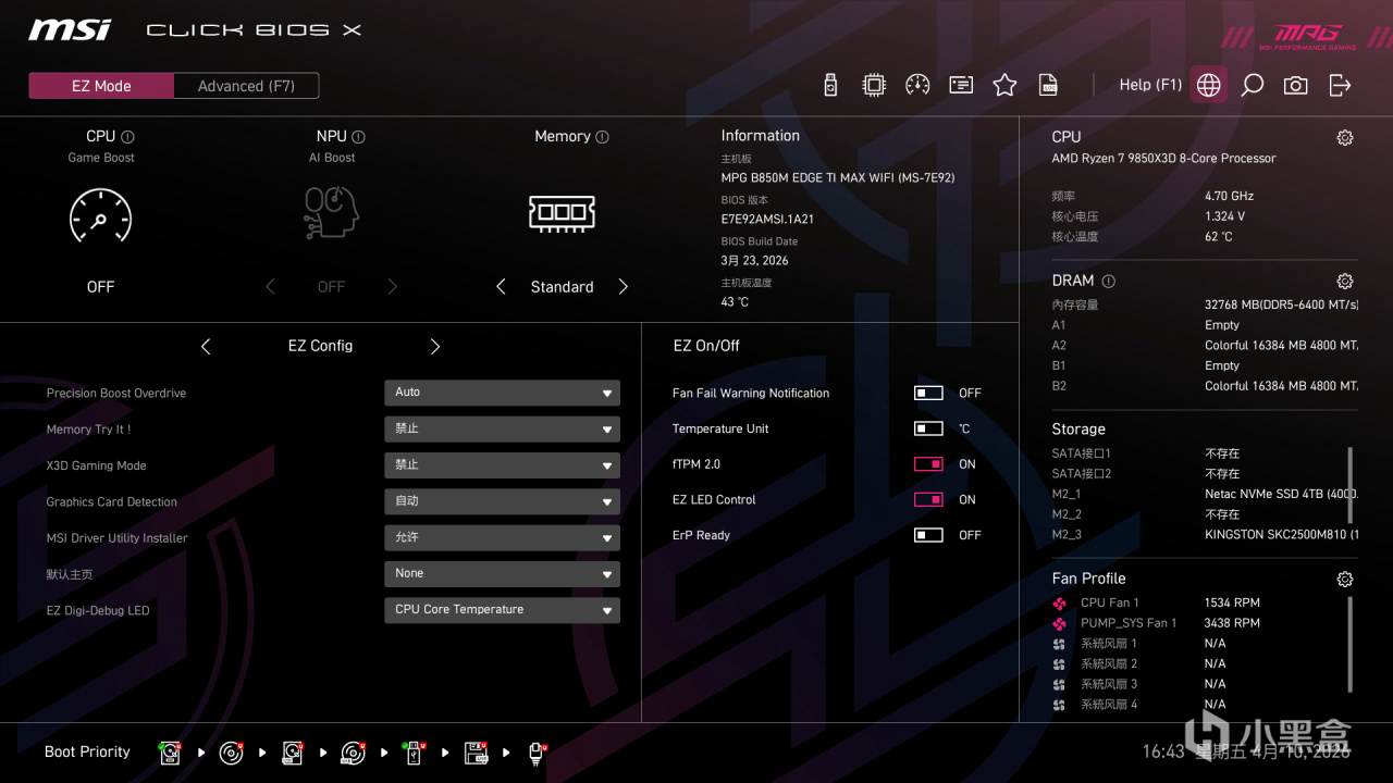 最新Click BIOS X的EZ Mode界面和布局展示,左侧是CPU、NPU和Memory三大模块,左下方则是一些常见的配置选项,比如PBO、Memory Try It!、X3D Gaming模式等等,右侧区域则是一些硬件信息,在整个界面的上方和下方还排列了一些功能图标。